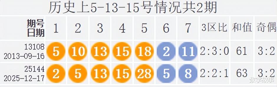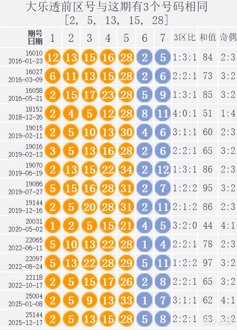 大乐透25144期前区号在过去是否出现过?大乐透25144期前区号: 2-5-13-15-28经查,历史上没有出现过与这一期5个前区号或者4个前区号一样的。与这一期3个前区号一样的有33期,取近15期如下: