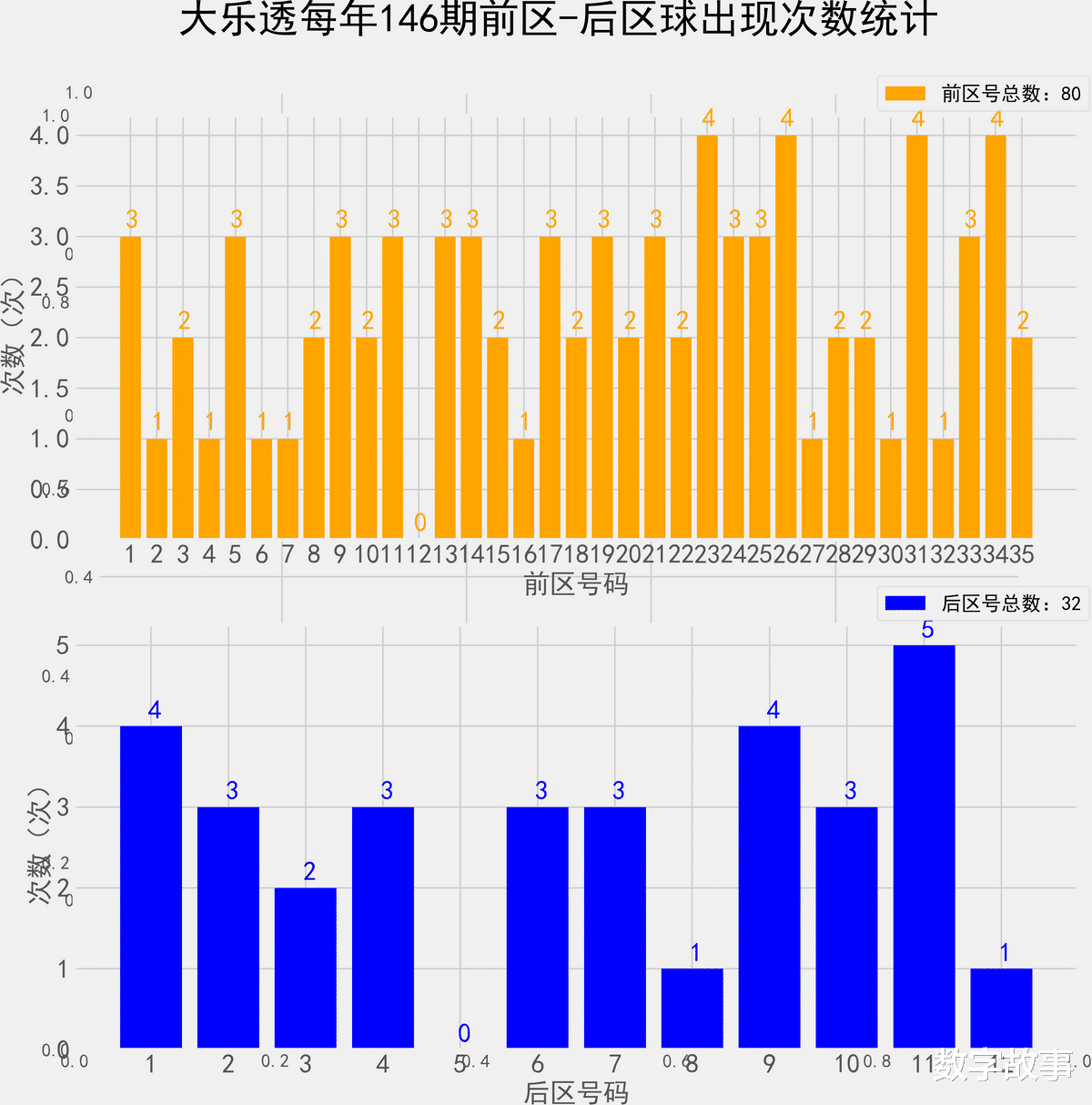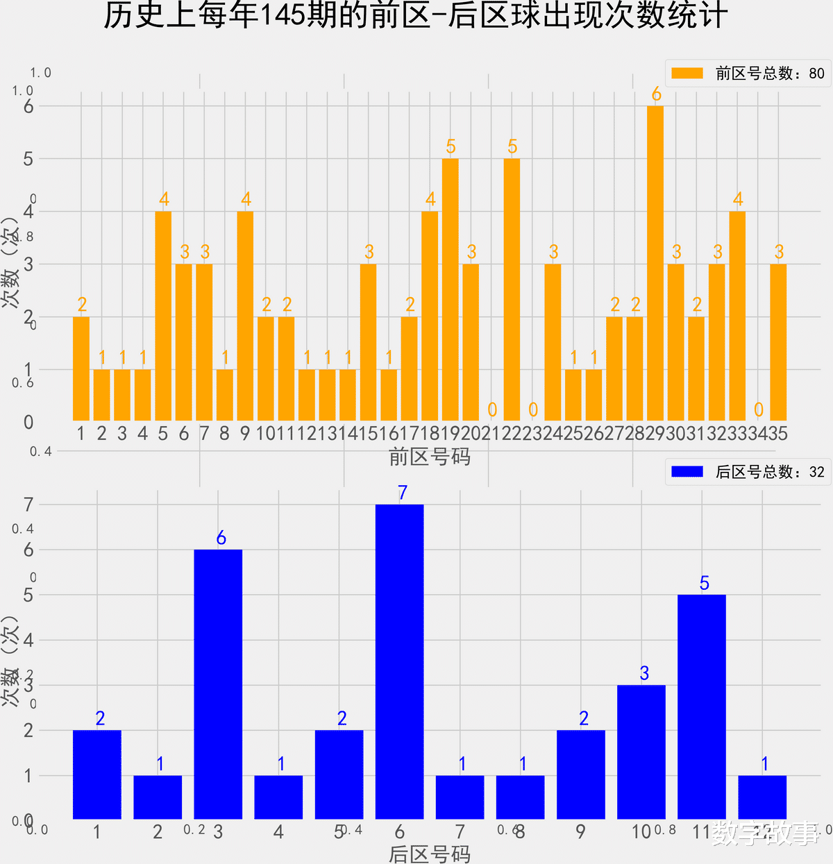 统计每年145期的样本数据: 80个前区号 32个后区号