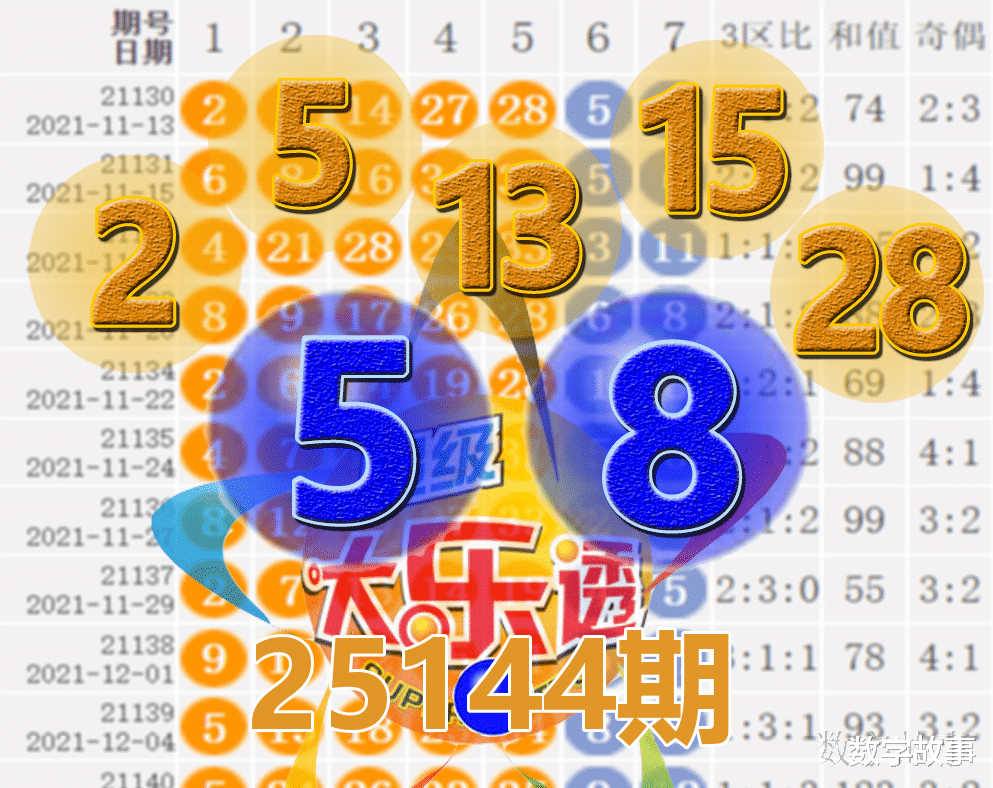 文末有大乐透前区号等差数2-15-28, 及5-13-15的历史统计。【体彩大乐透25144期开奖结果及统计】前区号和值63,后区5-8中断16期遗漏;15注一等奖,奖池8.184亿。