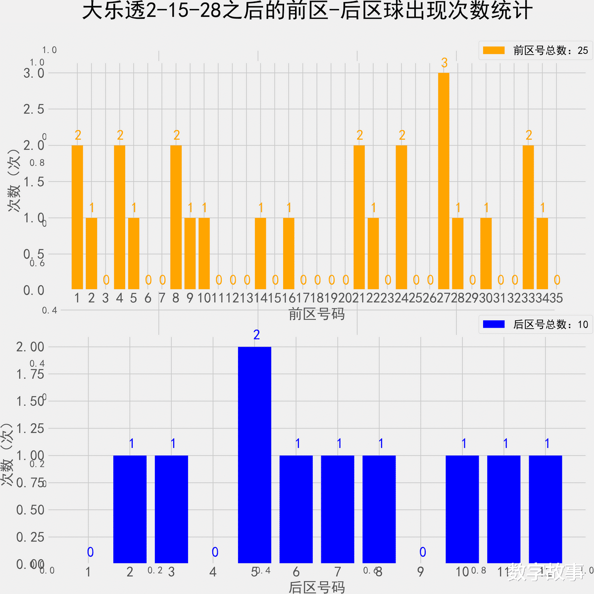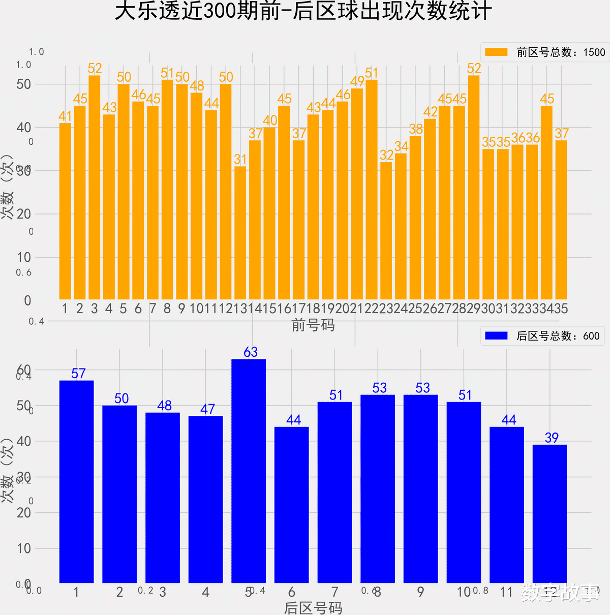 大乐透近300期前后区号统计情况统计样本数据: 1500个前区号码 600个后区号码