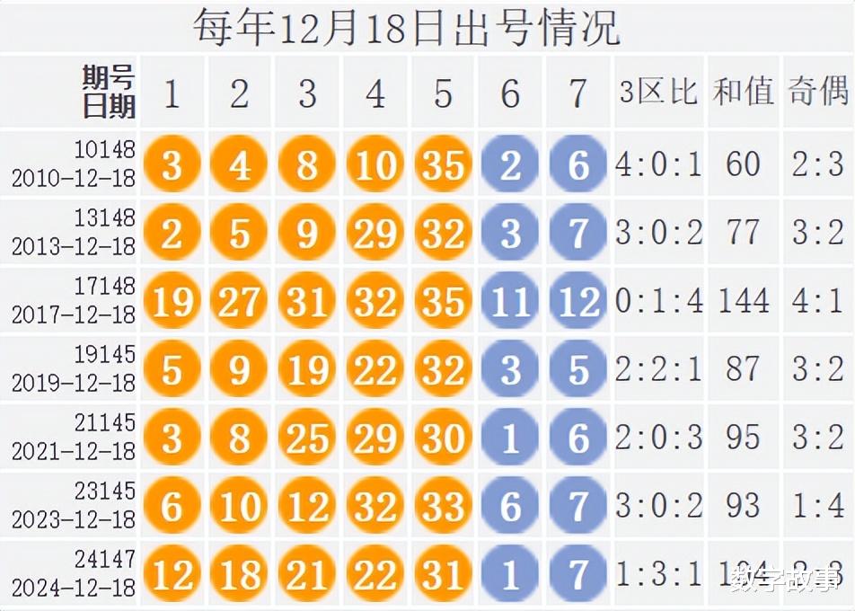 【其他历史数据查询统计】大乐透历史上的今天2025-12-18 星期四 大乐透不开奖每年12月18日出号情况: