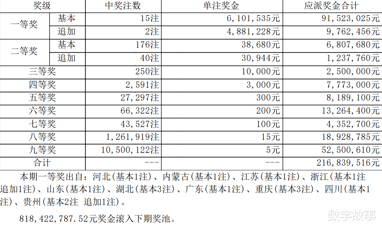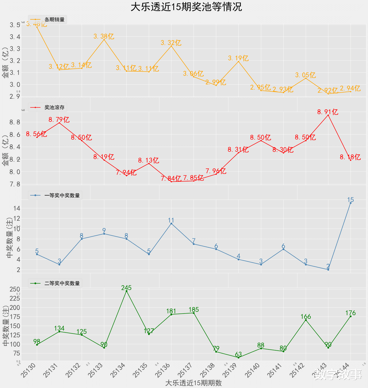 大乐透25144期一等奖:15注,追加: 2注二等奖:176注,追加: 40注。本期全国销售金额:2.940 亿 奖池滚存:8.184 亿.近15期奖池滚存, 中奖情况等信息: