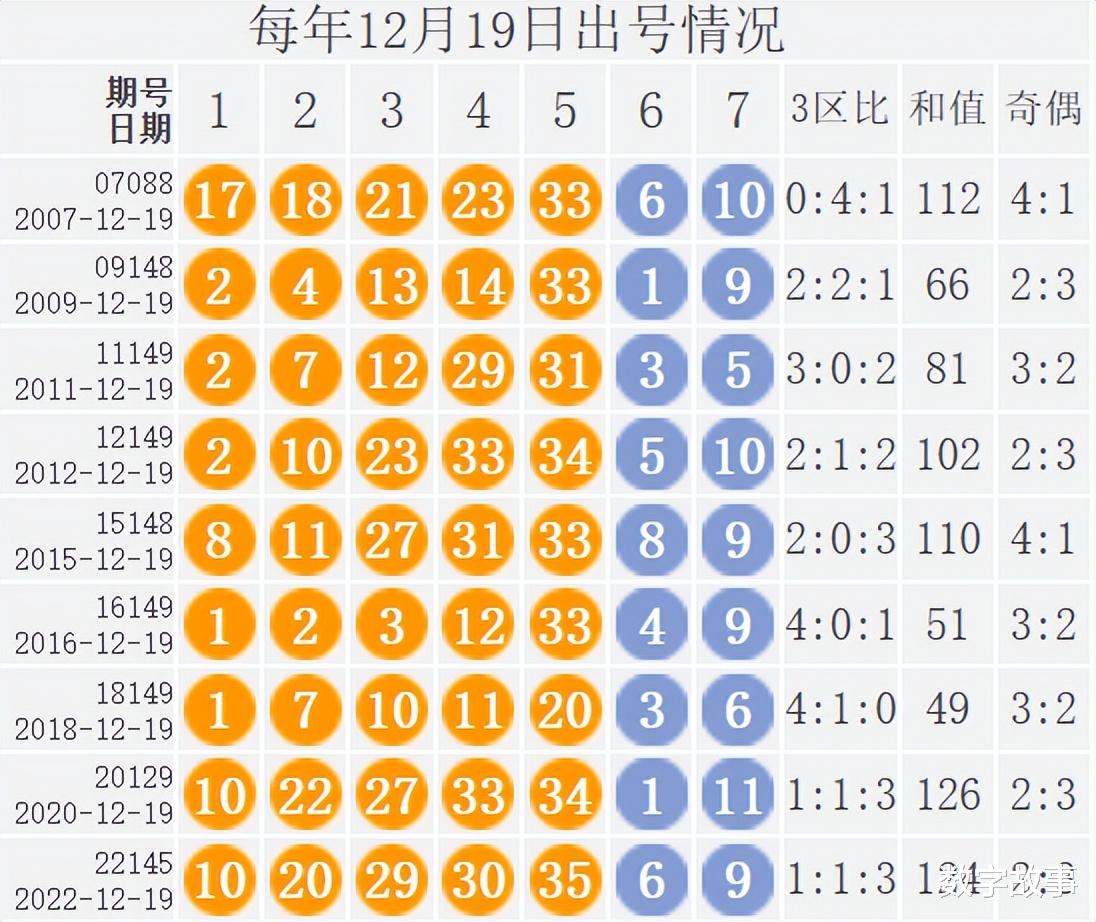 大乐透历史上的今天2025-12-19 星期五 大乐透不开奖每年12月19日出号情况: