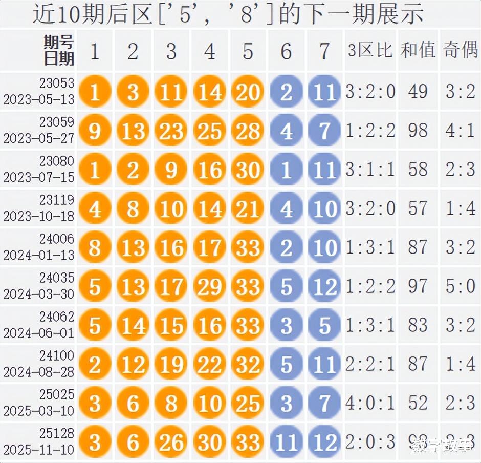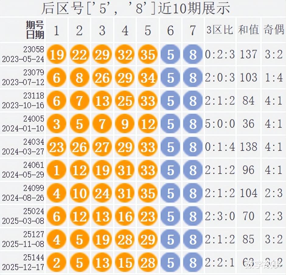 大乐透后区含5或8的双号遗漏次数统计大乐透后区组合5-8近150期出了3次,这次中断了16期遗漏。