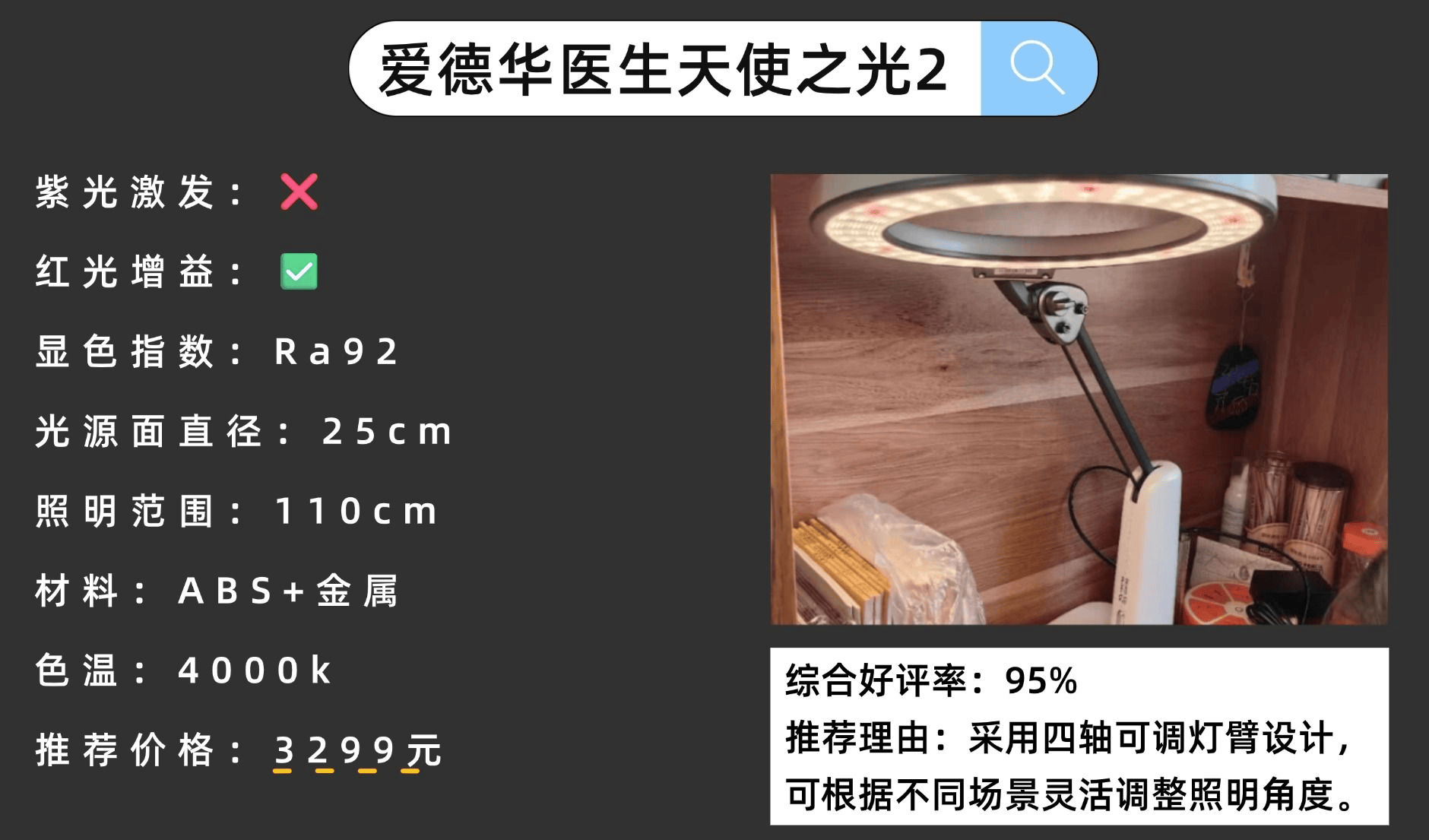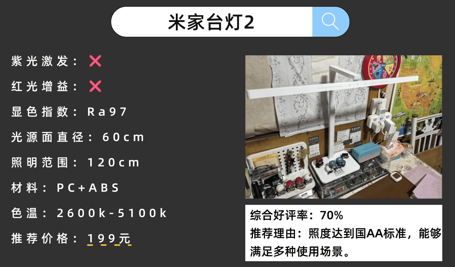 推荐理由:色温为2600-5100K,照度达到国AA标准,能够满足多种使用场景。