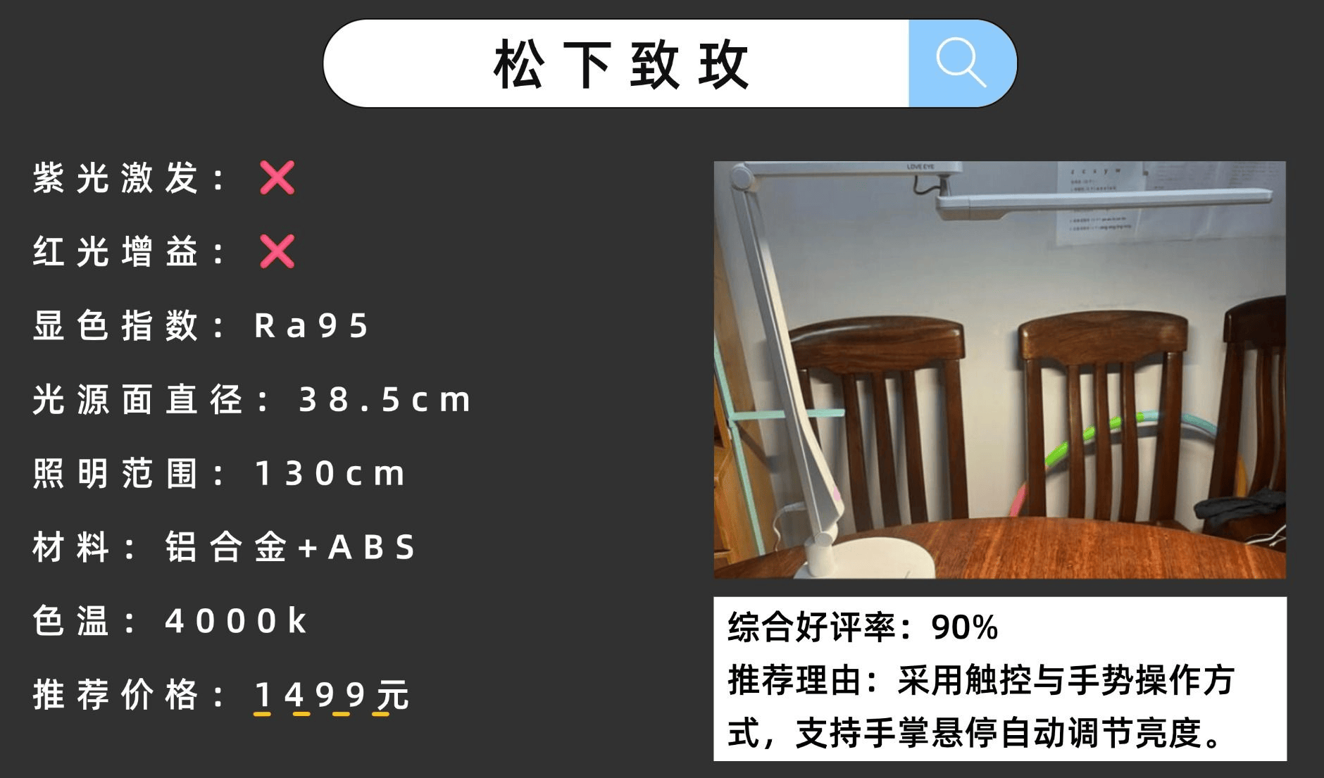 推荐理由:全景式5轴灯体设计搭配45cm长灯头,光线能覆盖1.8米的桌面。