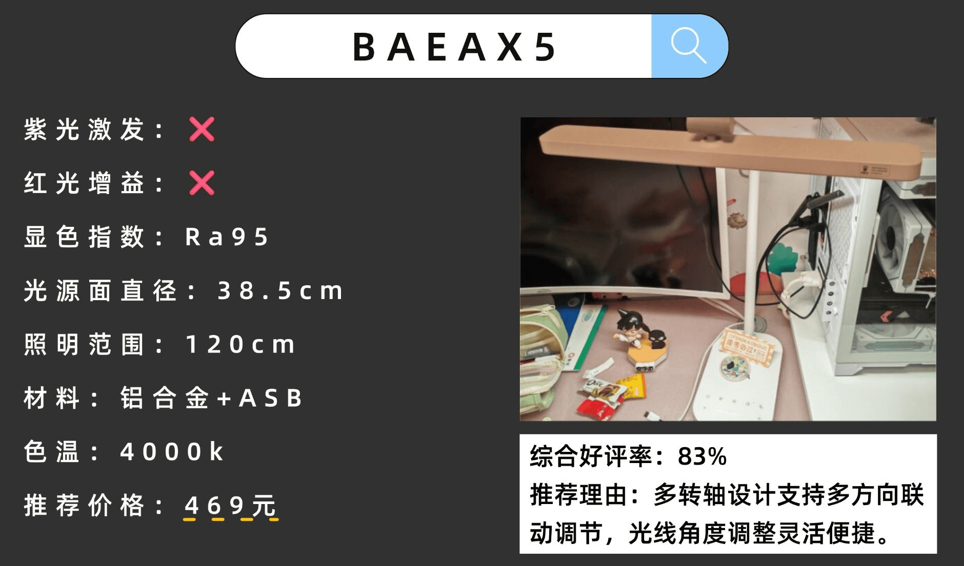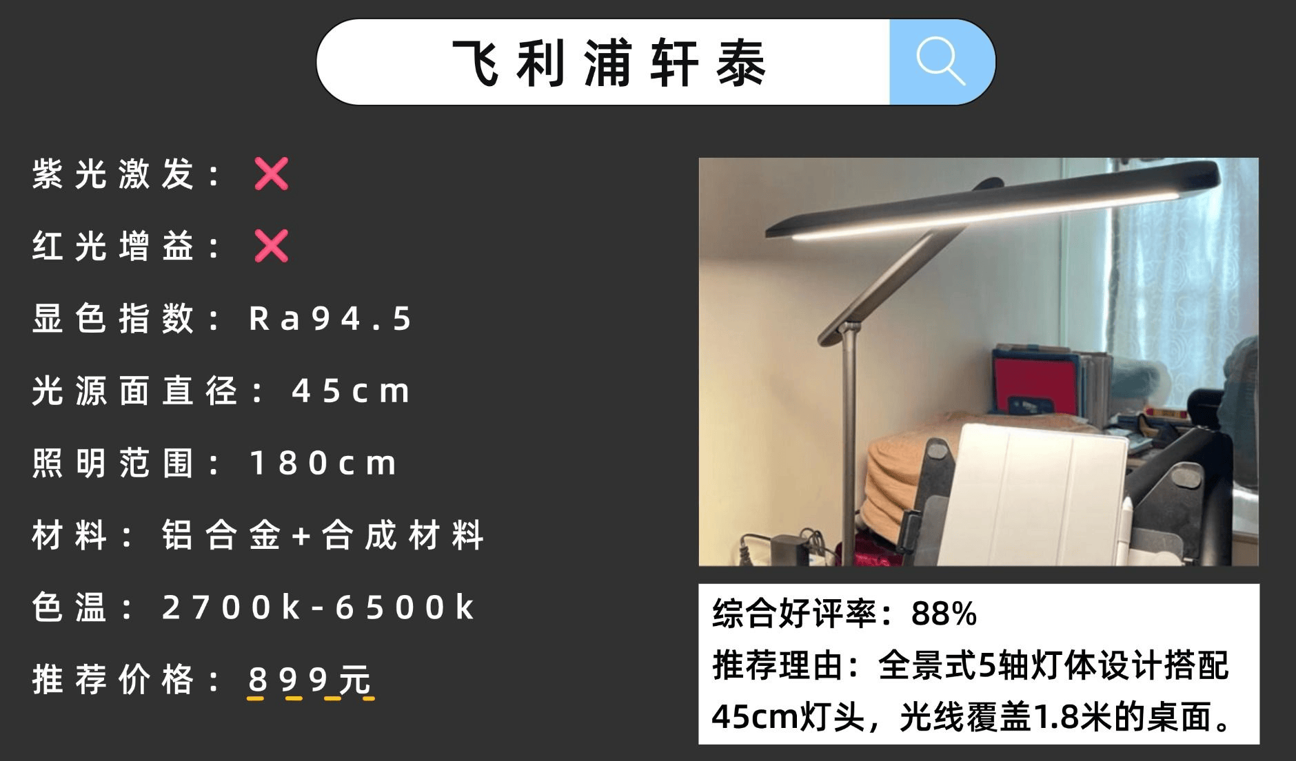 推荐理由:采用了385mm长的发光面,照明面积大,可以覆盖1.2米的桌面。