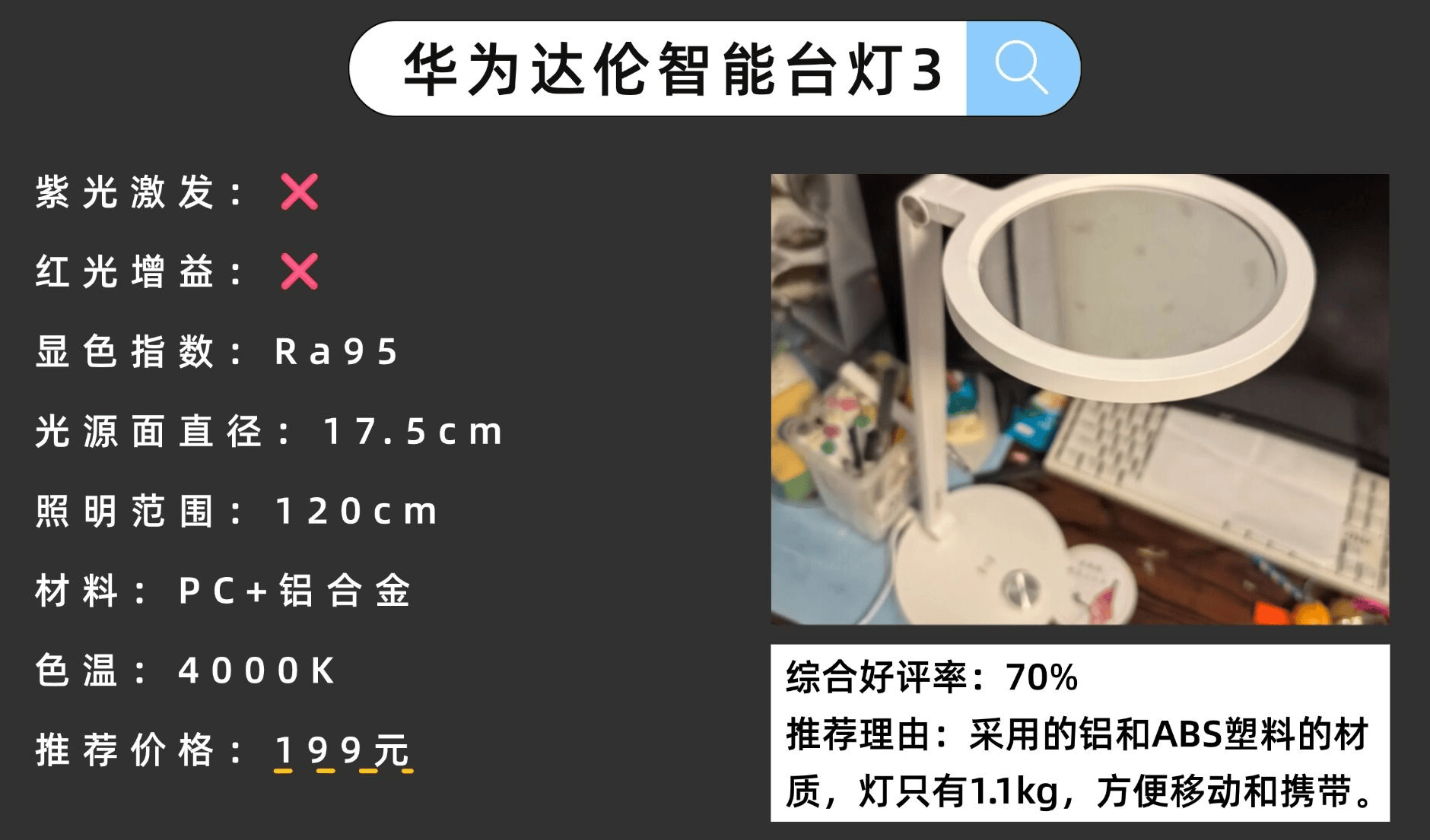 央视公认合格护眼灯品牌:华为达伦3台灯整体设计简约,小巧的圆形底座搭配多转轴结构,支持灯头、灯杆、灯盘折叠,可以节省空间,适合书桌空间有限的环境。其采用了铝和ABS塑料材质,灯仅重1.1kg,方便携带。