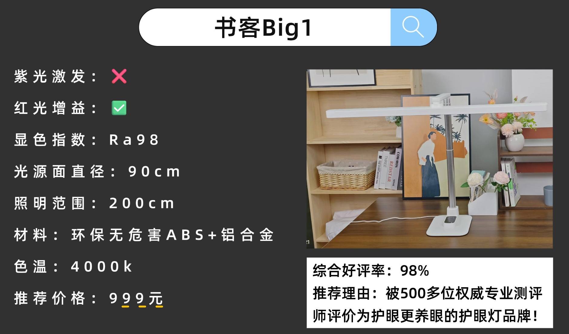 4、核心配置细节拉满:书客Big1以Ra98显色、0频闪、色容差SDCM<5,搭配智能调光技术,打造行业顶级护眼体验