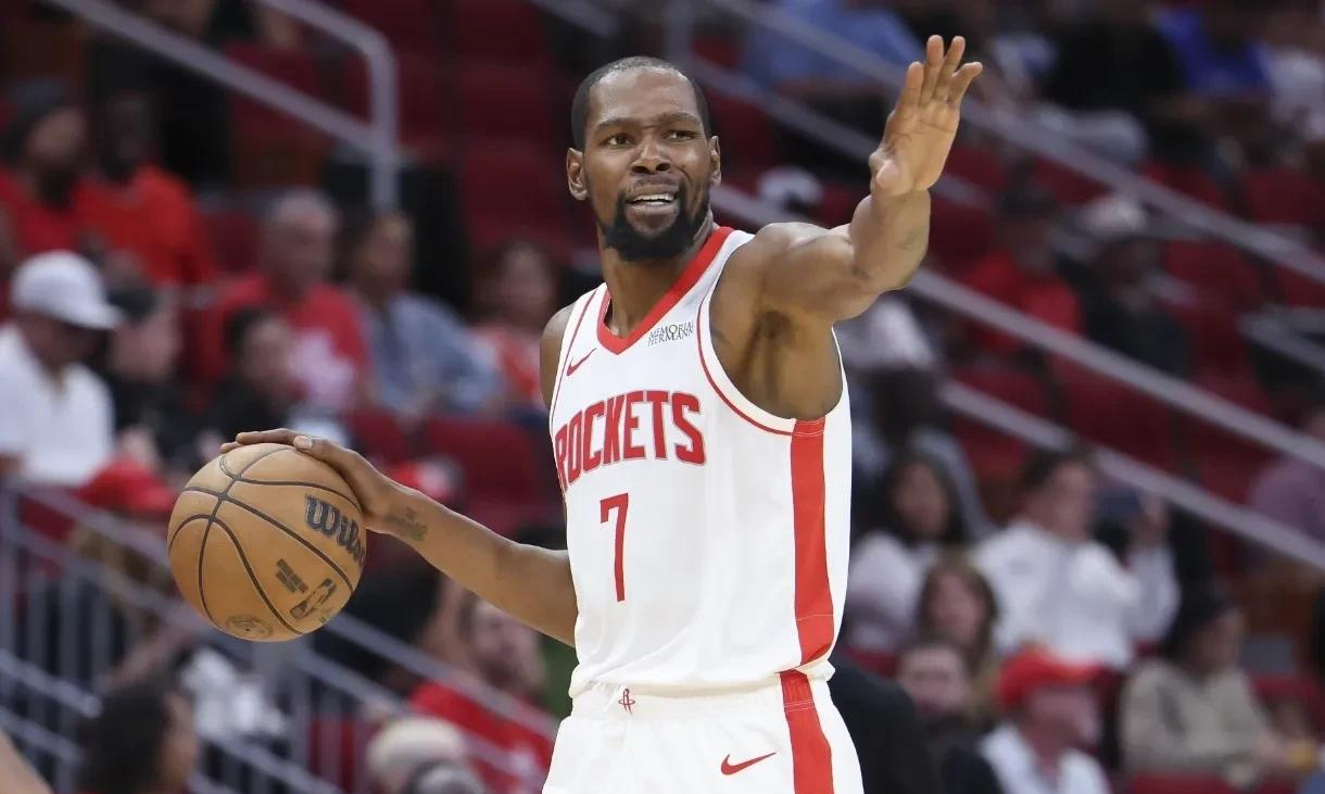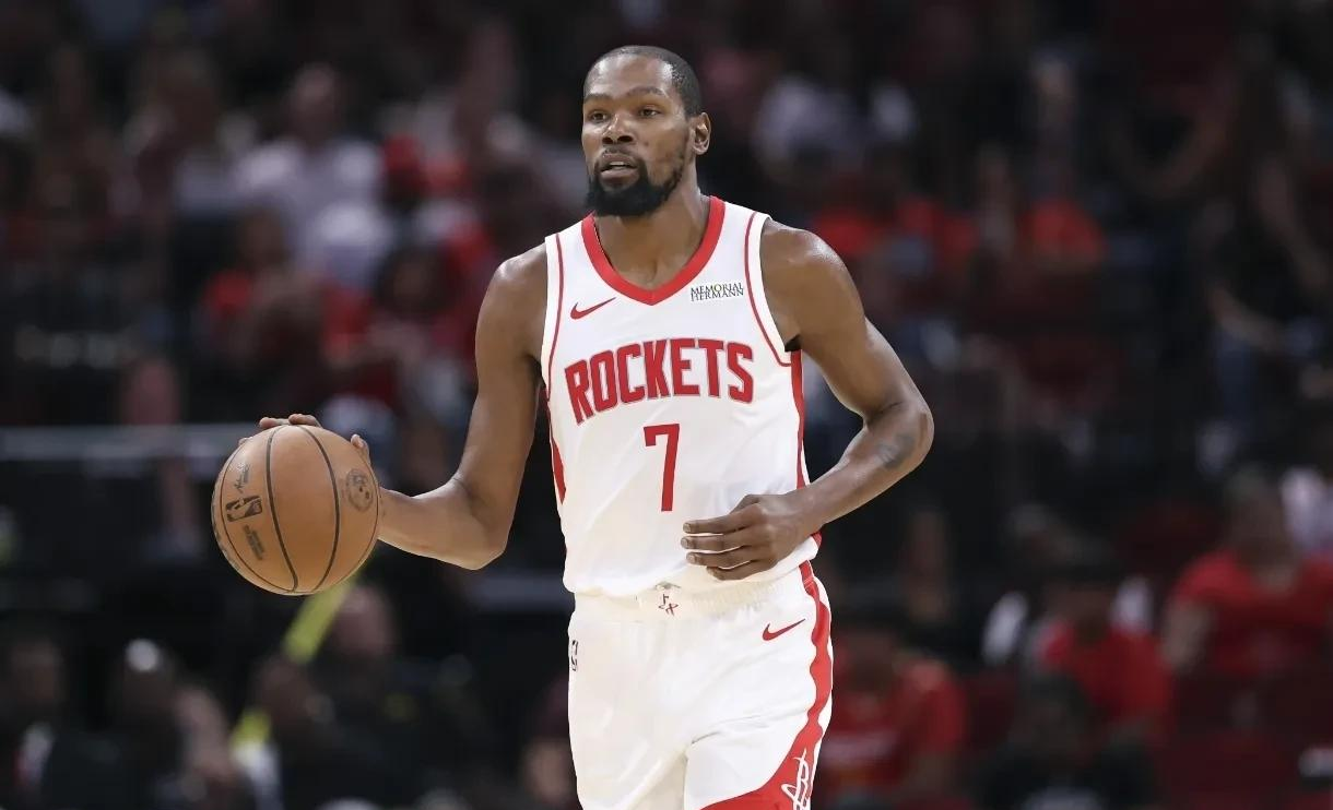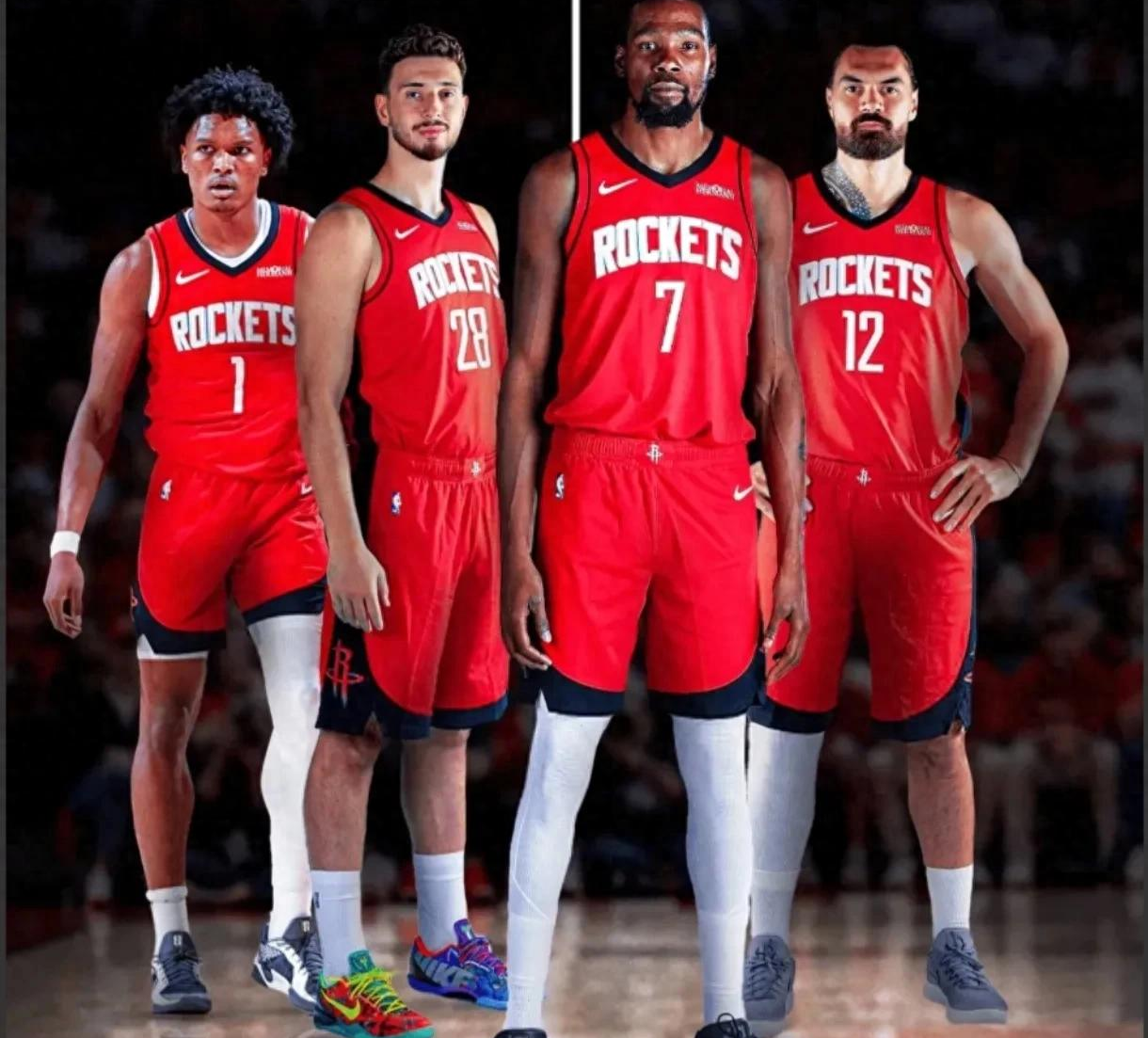 先来看看火箭今天的首发阵容,中锋位置是身亚当斯,大前锋位置是申京,小前锋位置是贾巴里史密斯,得分后卫位置是杜兰特,这4人的身高都是211cm,控球后卫是阿门,身高201cm,可以说在整个联盟,也没有球队能够排出这样的阵容吧。