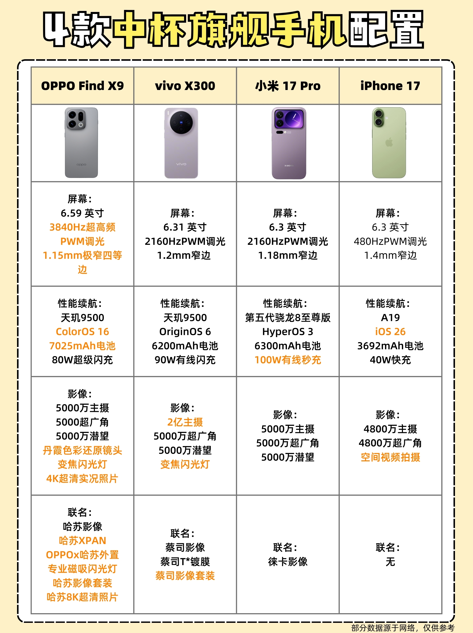 我滴乖乖,今年中杯旗舰影像真的卷到头了。。。OPPO Find X9上了哈苏四摄,还有4K超清Live;vivo X300上了2亿主摄;小米 17 Pro依旧有徕卡加持;iPhone 17可以拍空间视频,各出绝招。