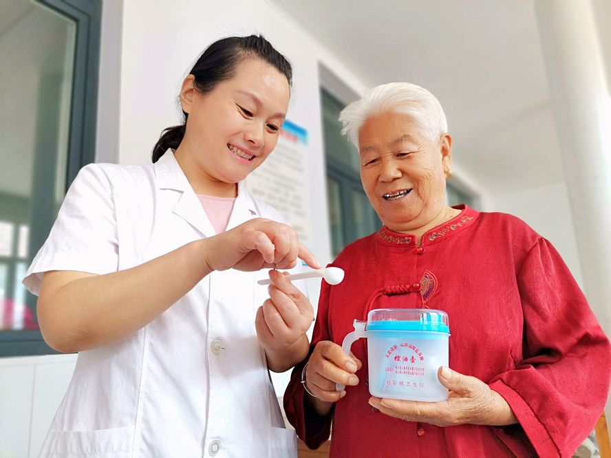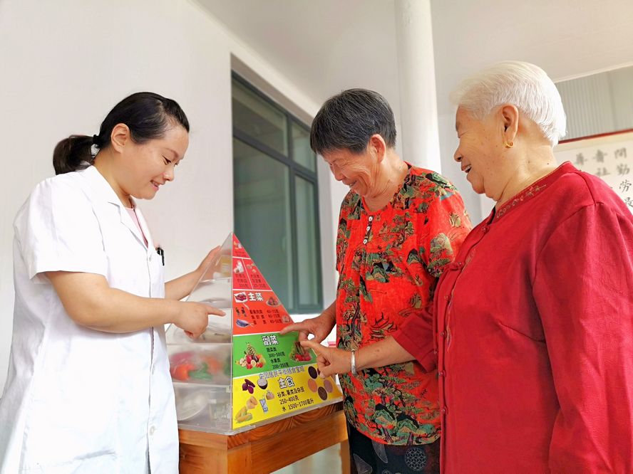9月17日,桓台县荆家镇卫生院“向阳花”家庭医生团队走进吴元村长者食堂,向居民赠送控盐勺、控油壶等工具,普及高盐饮食危害