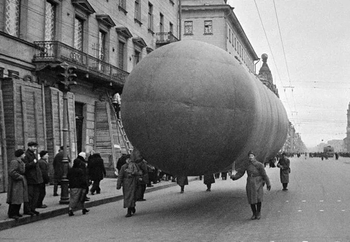 上图_ 941年的列宁格勒街头,苏军正在运送一艘观测气球,可以用来查探军事情报