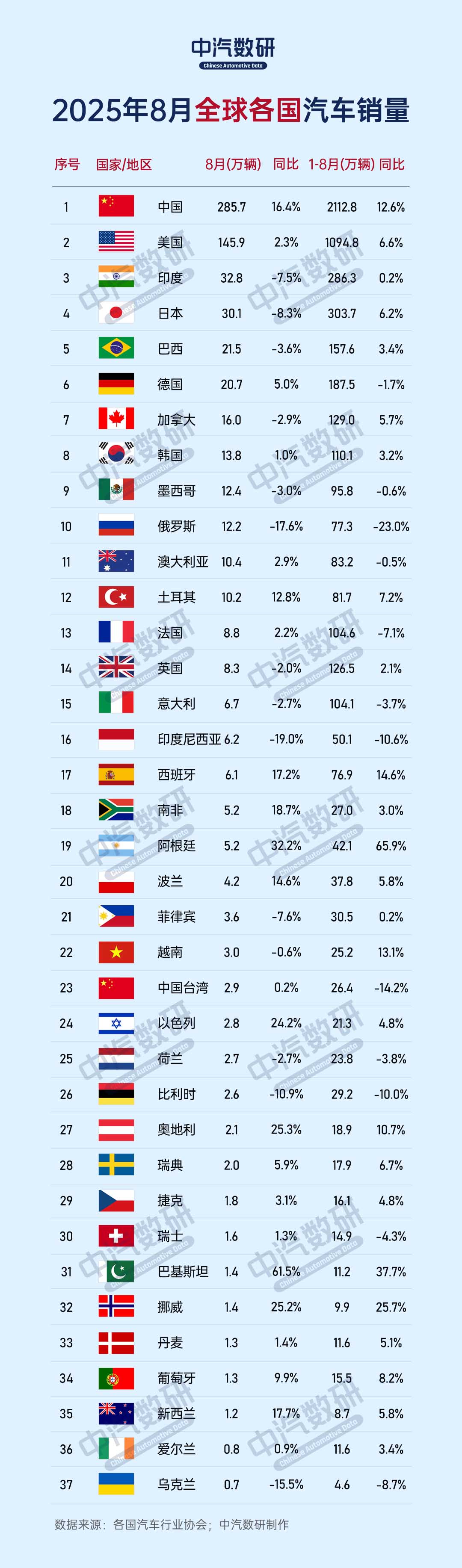在本次统计的8月份37个国家的汽车销量中,印度、日本、巴西等14个国家的销量同比呈下滑趋势,中国、德国、澳大利亚、巴基斯坦等国家呈上升趋势。