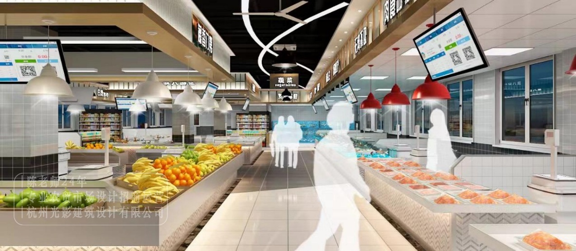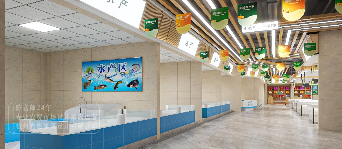 杭州光影农贸市场设计公司的专业技术,从柜台设计(水产防溅水、熟食封闭式)到消防规范(喷淋、疏散指示),一站式解决!