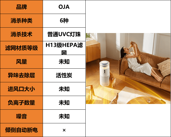 OJA长期做智能家电。它这款面向养宠家庭的空气净化器带水离子加湿。加湿时能压住部分浮尘,毛发更容易被进风口收集。机身有PM2.5监测,自动调速。全天开着也省心。