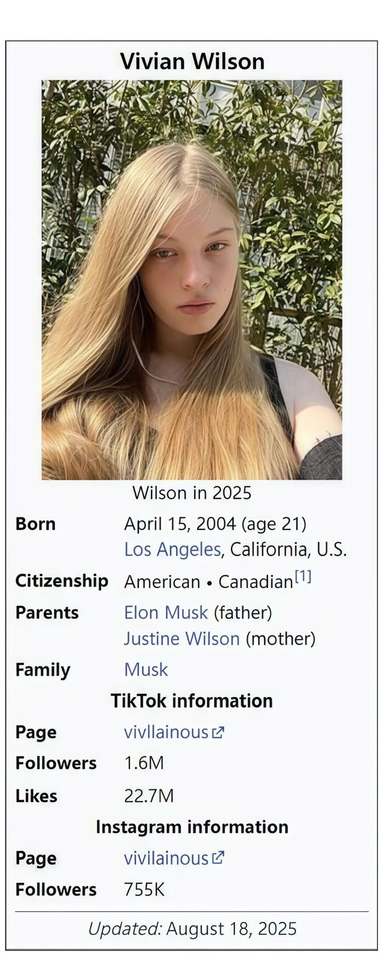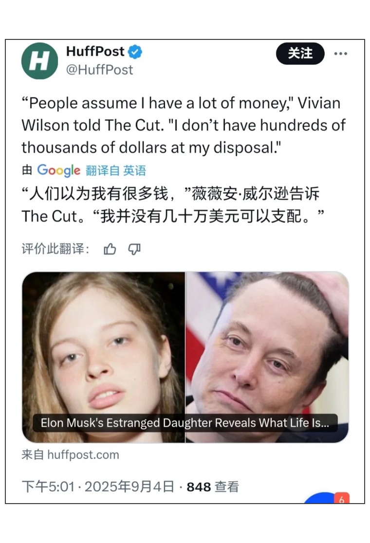 可以看出,父女俩的关系可以说并不是很好,所以薇薇安不仅不想继承马斯克的财富,还干脆在法律上“切割认同”:2022年,她申请更改姓名及性别,正式改为 Vivian Jenna Wilson,并声明“不希望和他有任何瓜葛”