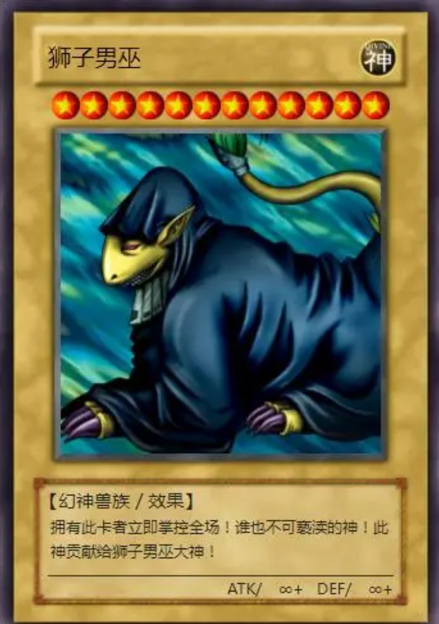 综上所述,除了初代《游戏王》里面能确定四张神之卡,别的版本的都算不上真正的神之卡。当然,除了“狮子男巫”。