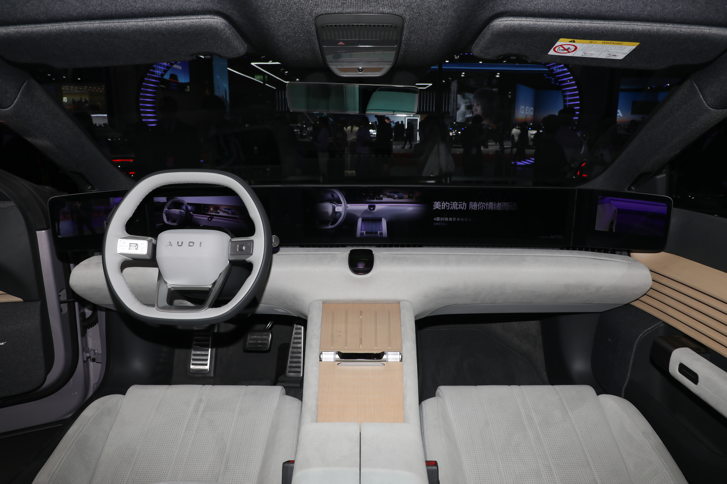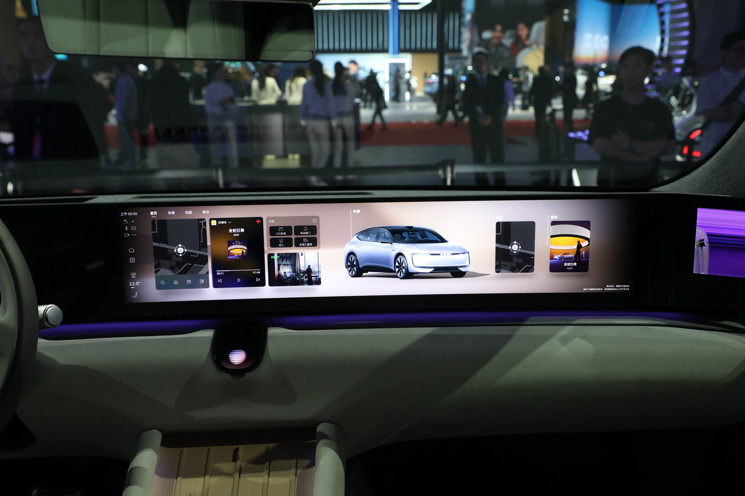 奥迪E5 Sportback的内饰设计风格较为简约,配备尺寸为59英寸的贯穿式大屏,分为仪表屏、中控屏、副驾屏以及两侧的电子外后视镜显示屏,搭载高通骁龙8295芯片,应用HMI系统,界面UI采用低饱和度色彩,提供拟态玻璃卡片、3D专场、3D壁纸等。另外该车还配备全场景陪伴奥迪助手,基于火山引擎大语言模型“豆包”深度定制,支持全场景交互。