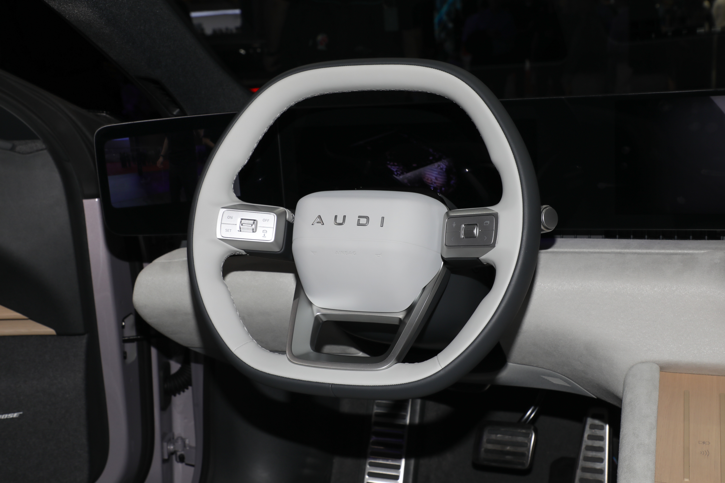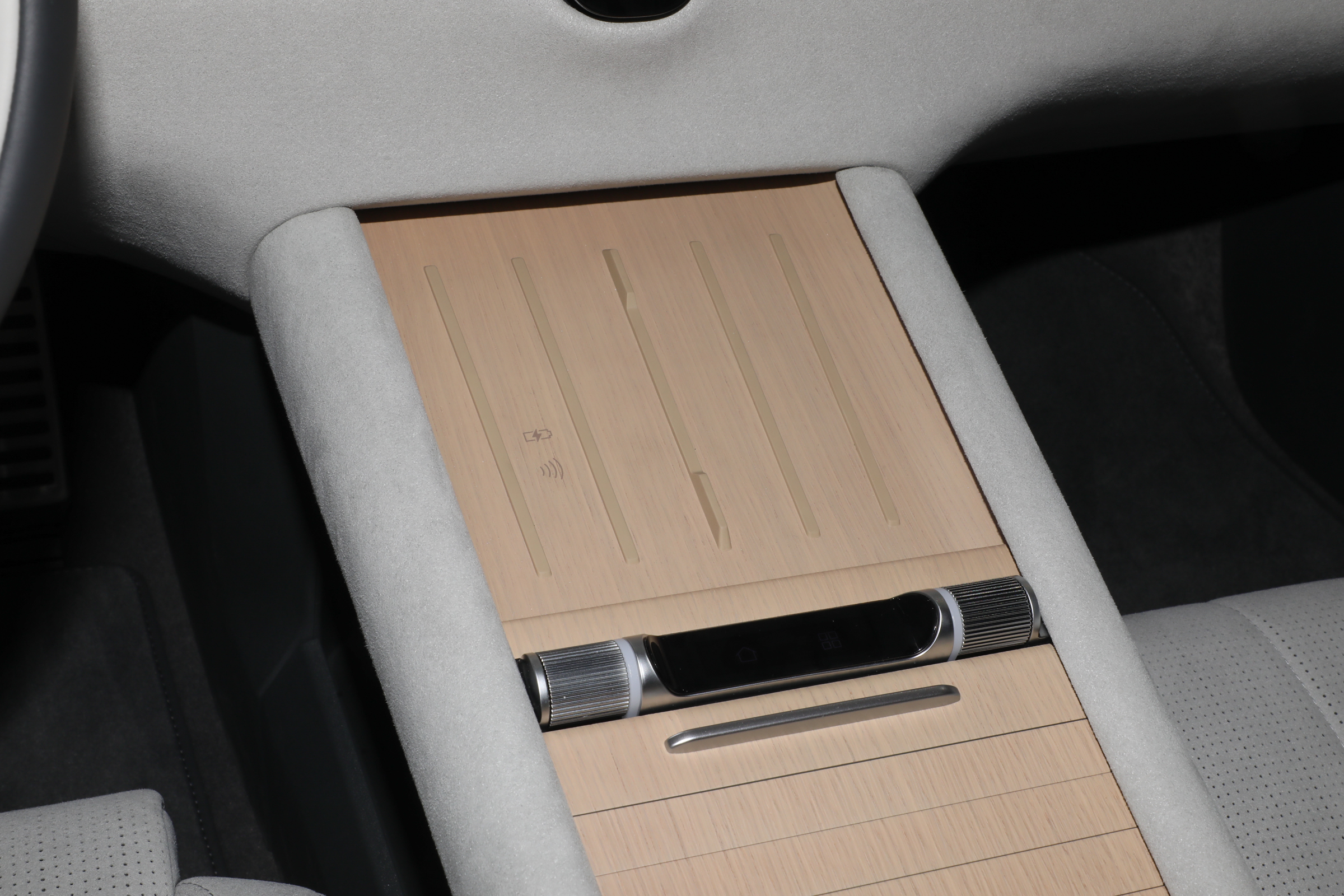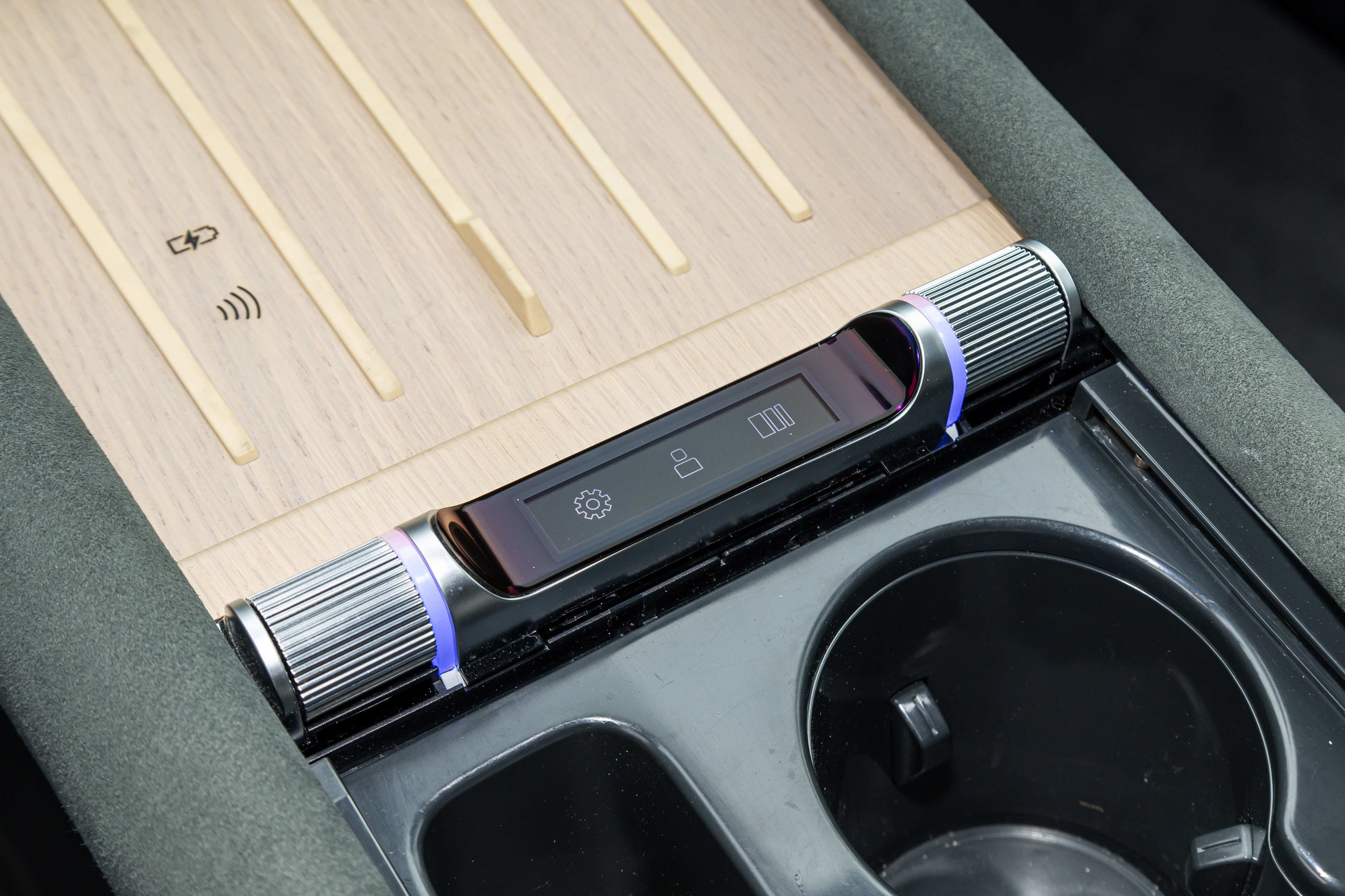 奥迪E5 Sportback配备四辐式方向盘,并应用怀挡式换挡机构,副仪表台区域提供手机无线充电面板、储物格等,还配备有奥迪智慧岛,两侧滚轮颗根据个人偏好进行设置,中间屏幕则类似于苹果电脑此前的TouchBar功能,同样支持自定义。
