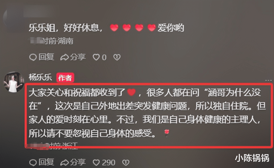 面对舆论风波,杨乐乐及时作出回应。她解释,事件发生得突然,汪涵当时在外地出差,无法立刻赶到医院。但汪涵在得知消息后,第一时间安排了当地的朋友帮忙照应,许多细节杨乐乐没有公开提及,这才导致大家误解。杨乐乐还通过文字强调“家人的爱时刻在心里”,侧面辟谣了离婚传闻,并表示17年的感情已从爱情升华为亲情,彼此是坚实的家人。