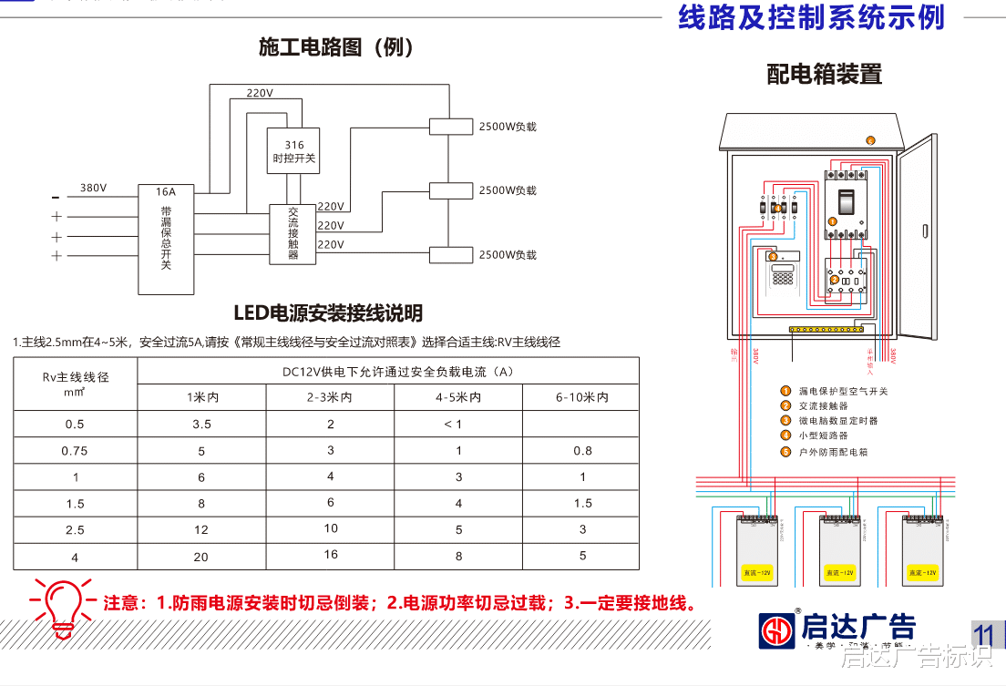 电源线径需根据发光字字体大小、模组数量、功率及与主线距离综合判断:若距离过远却选用线径过小的电线,电流传输时会产生大量热量,长期累积易导致绝缘层融化,引发线路短路起火。
