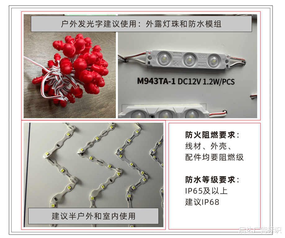 LED模组通常一串20组,按国家标准需采用“错位接线法”,若接线时忽视规范,零线火线在强电流作用下易直接接触,瞬间引发短路。尤其当发光字字体较大时,布线回路设计至关重要,回路不合理不仅影响发光效果,更会增加电路负荷,埋下安全隐患。另LED灯带建议用半户外和室内。