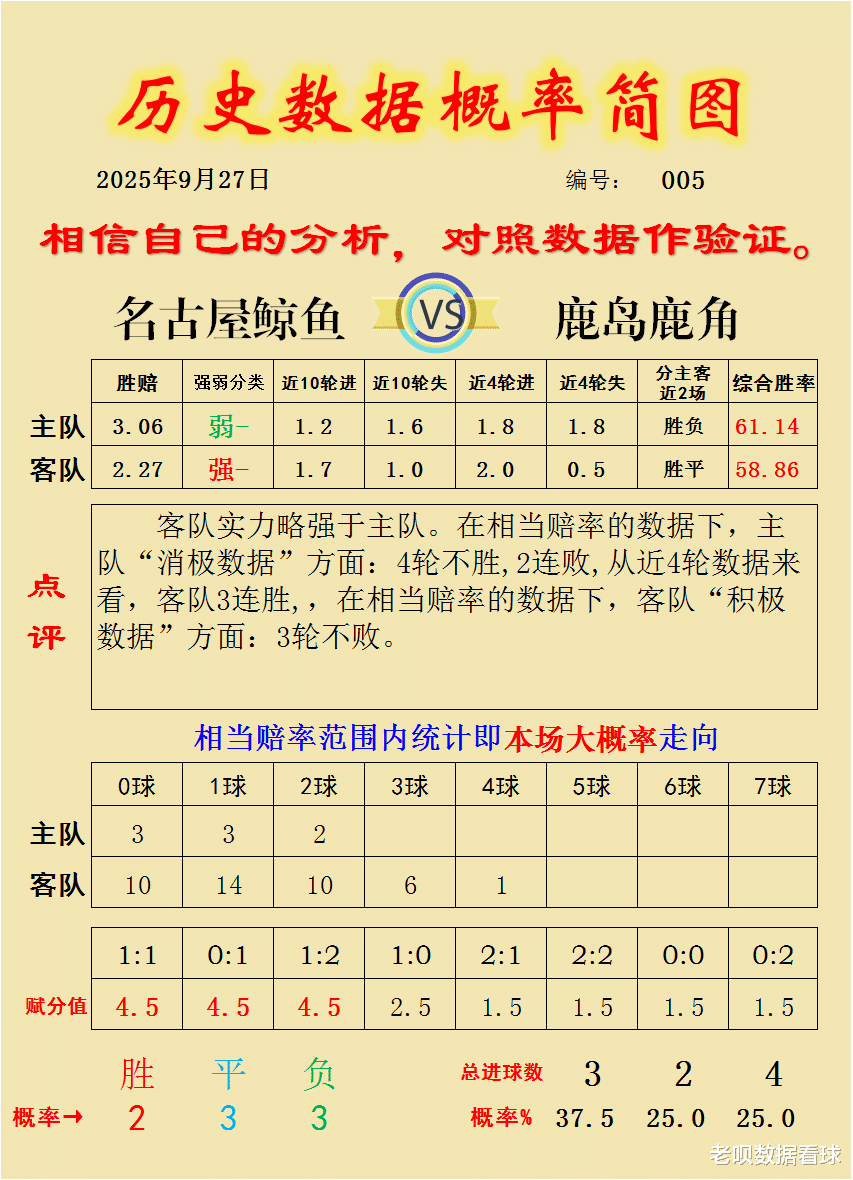 客队鹿岛鹿角近5场4胜1平0负,积13个积分,其中近5个主场3胜1平1负,积10个积分。客队客场战力较弱,客场平均积分比近5轮平均积分-0.6个积分;近5场打进10球失3球,场均进2球,失0.6球,其中:客队客场近5场打进6球失4球,场均进1.2球,失0.8球。有一定进攻力,场均进1.2球,防守同样出色,场均失0.8球。