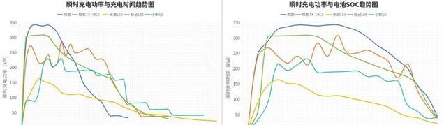 通过综合功率和SOC相关数据,还能反映出更多细节。岚图知音的补能效率明显高于其他四款车型,在SOC 5%的低电量状态下实现高功率充电,充电2-3分钟、SOC 21%左右时达到最高344.6kW的充电功率,且能维持近8分钟保持充电功率在300kW以上。