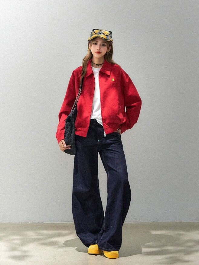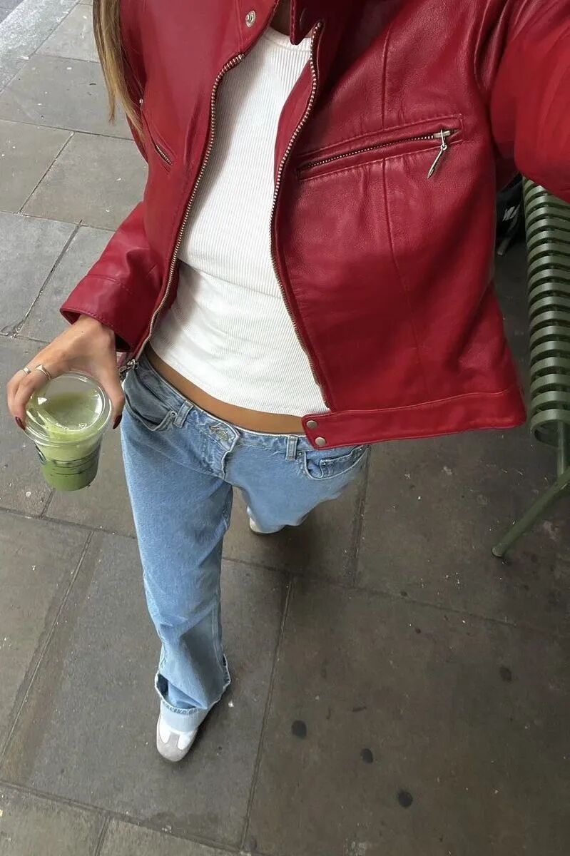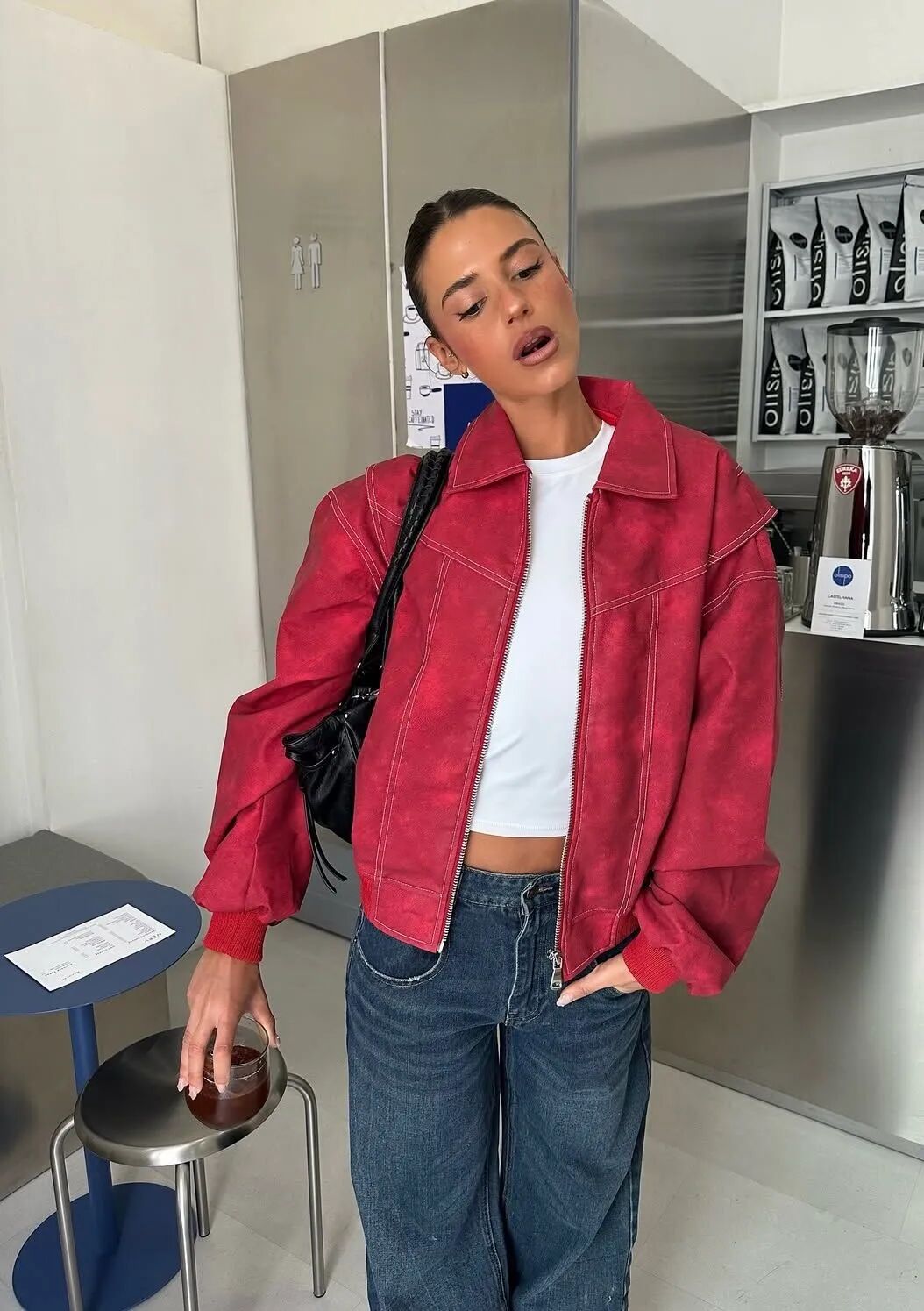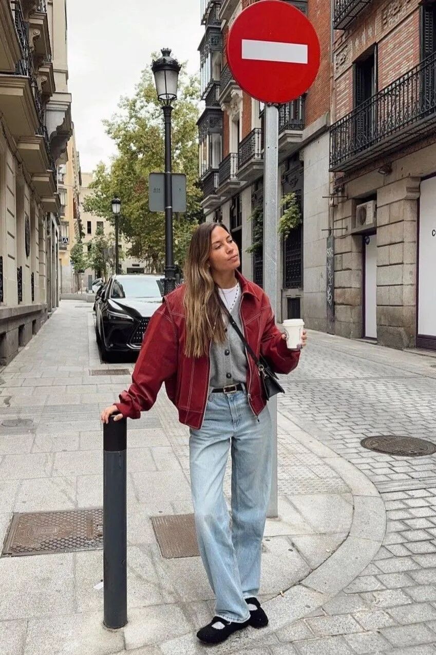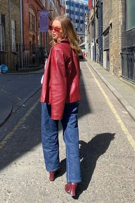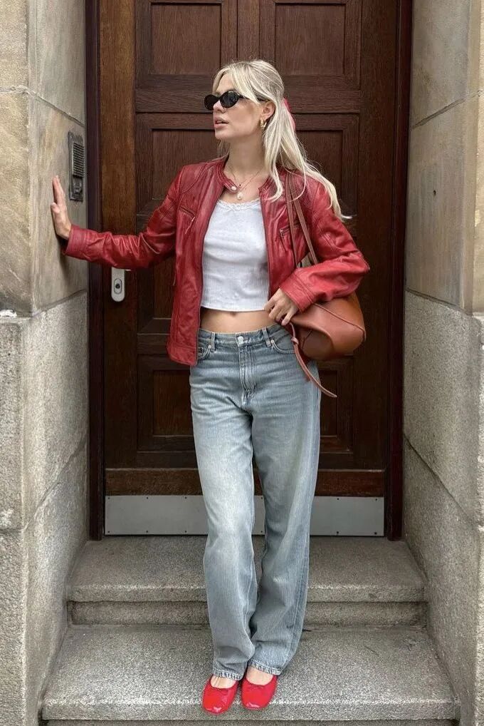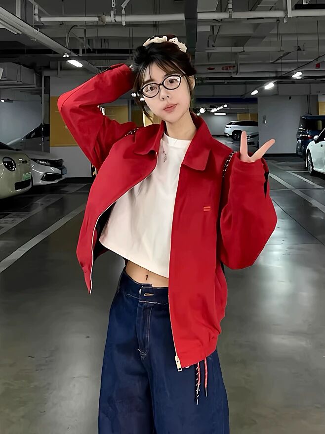 红色短款夹克搭一条水洗蓝牛仔裤,
