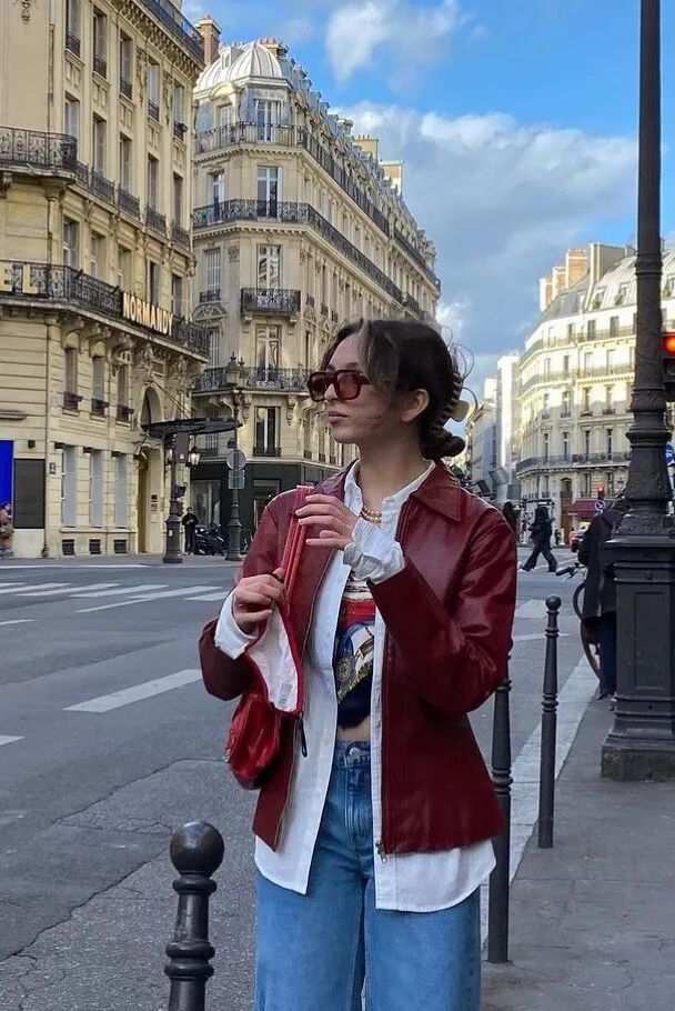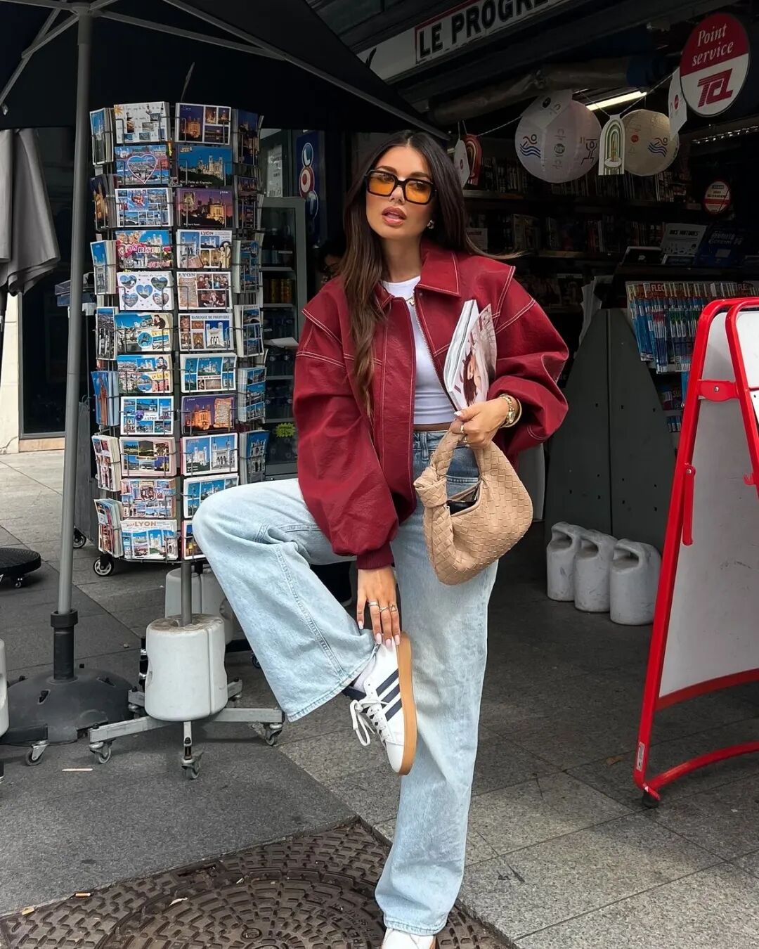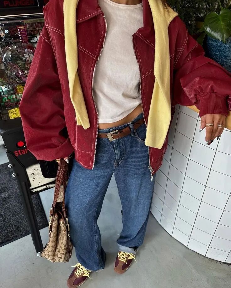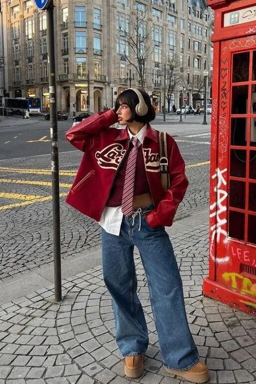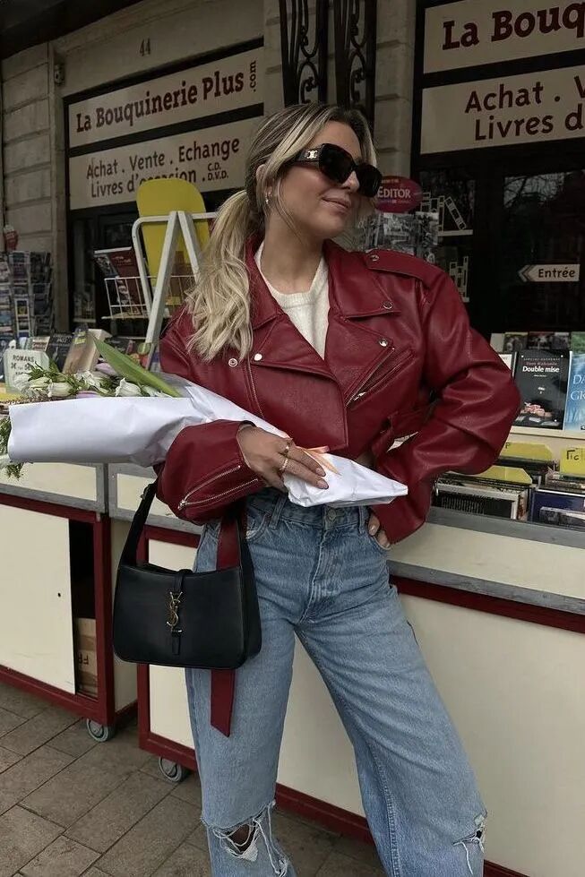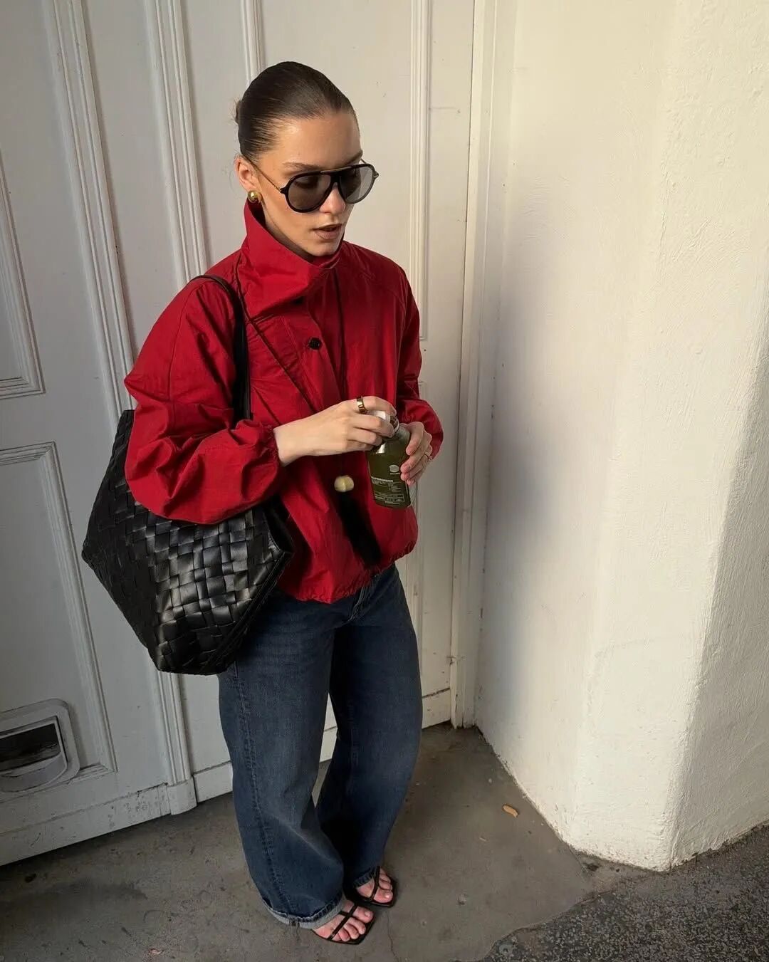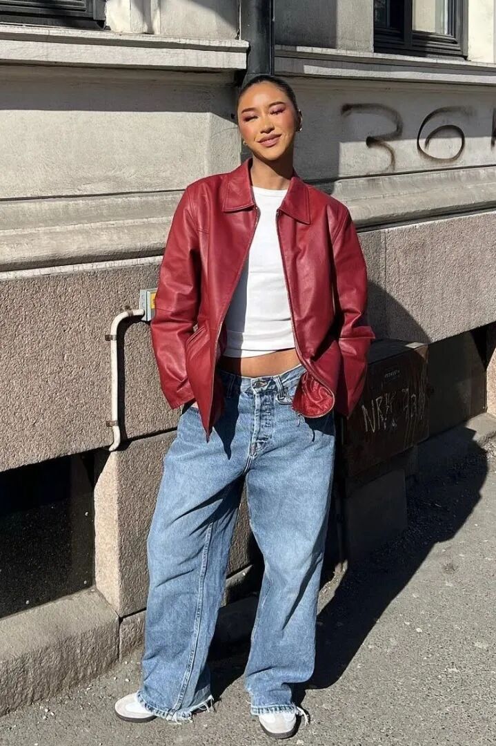 红色短款夹克搭一条水洗蓝牛仔裤,