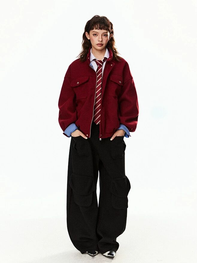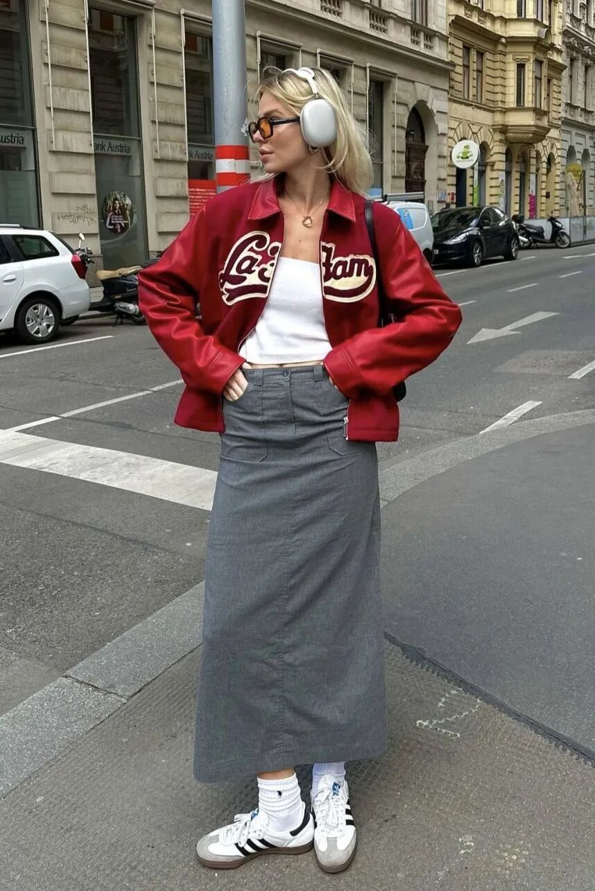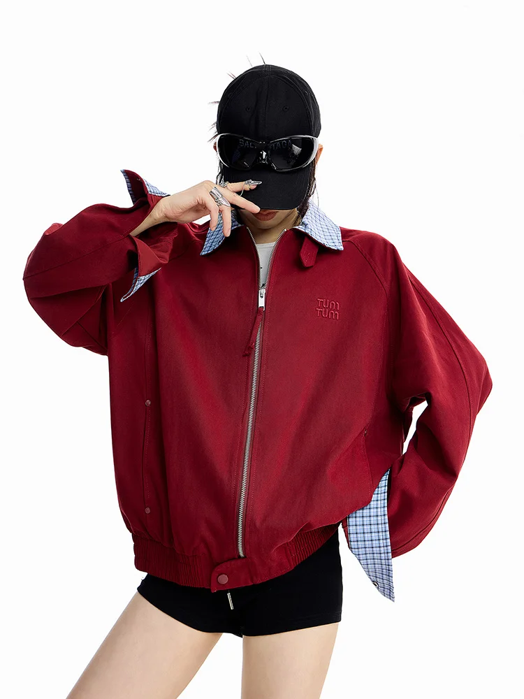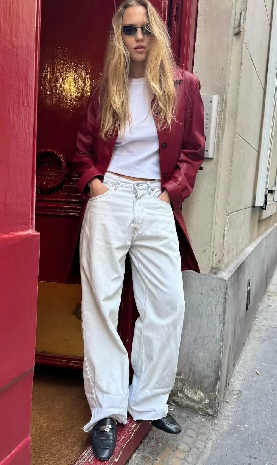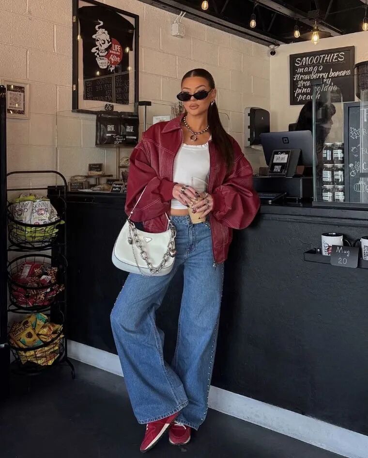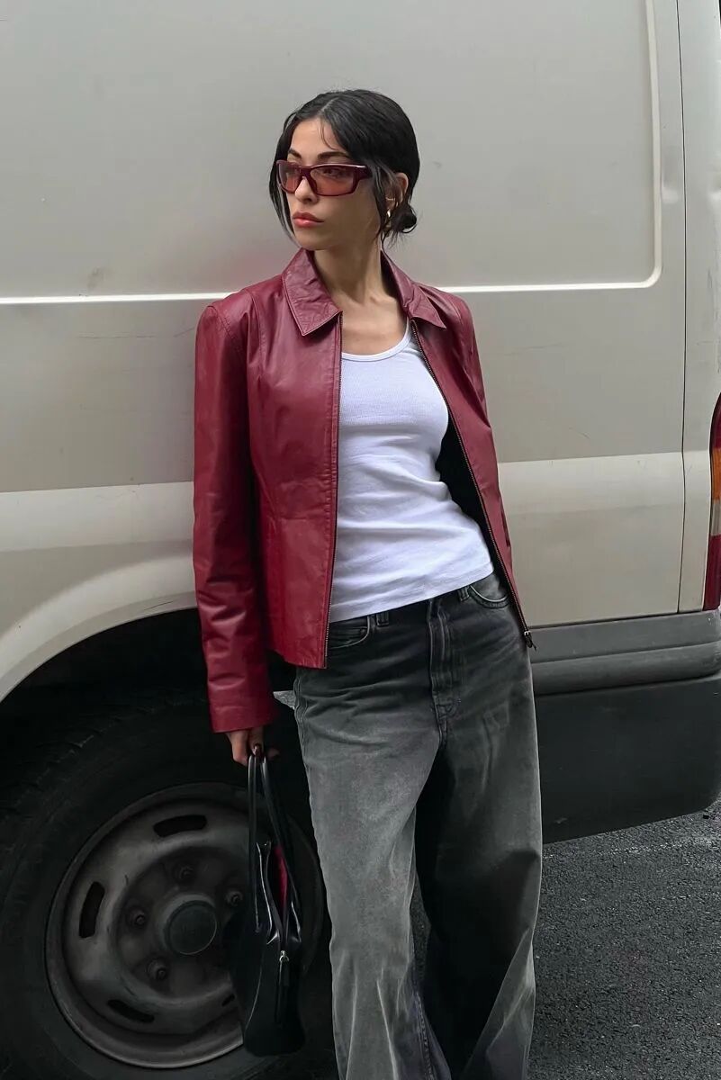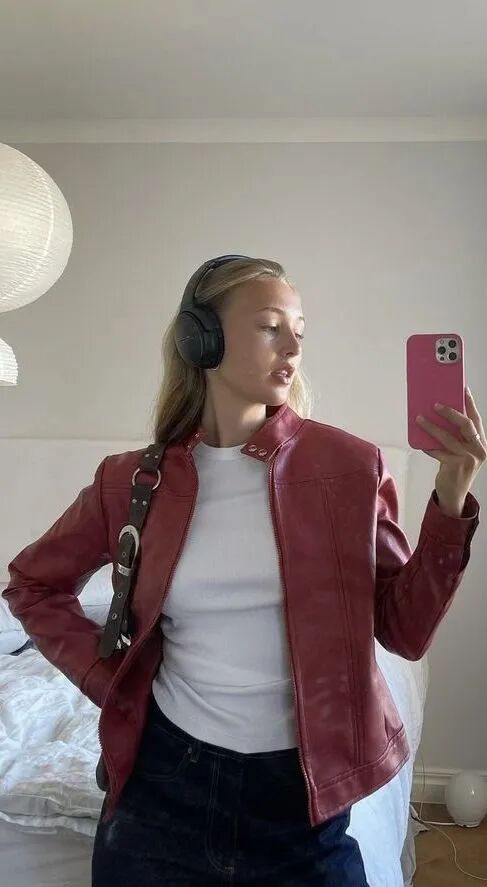 红色短款夹克搭一条水洗蓝牛仔裤,