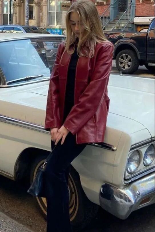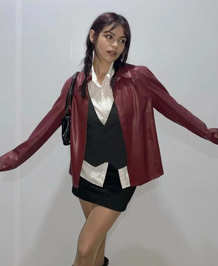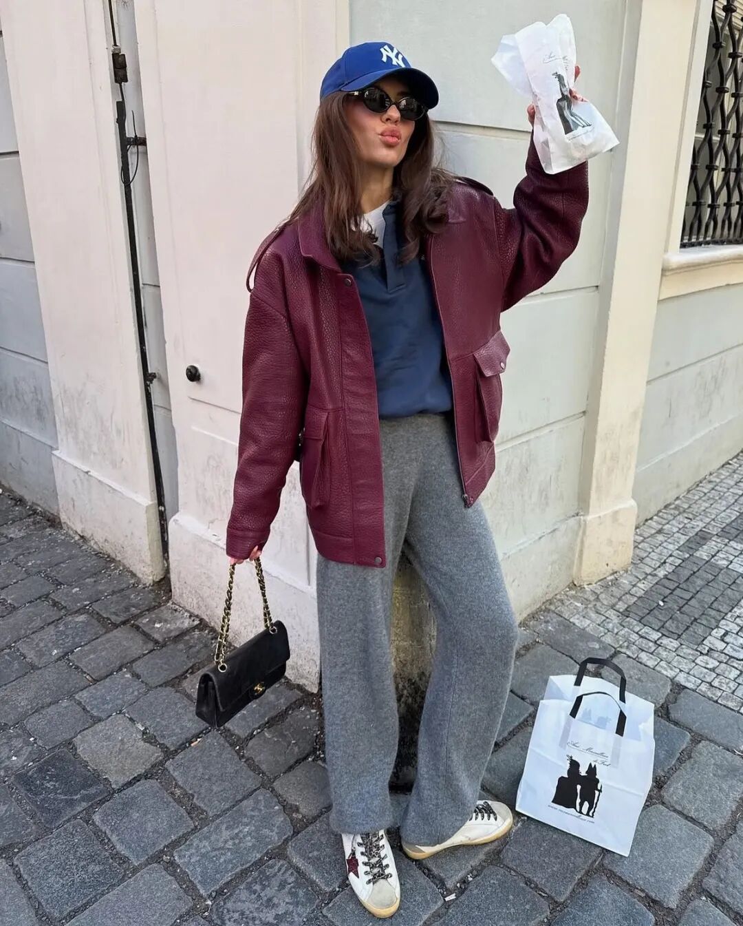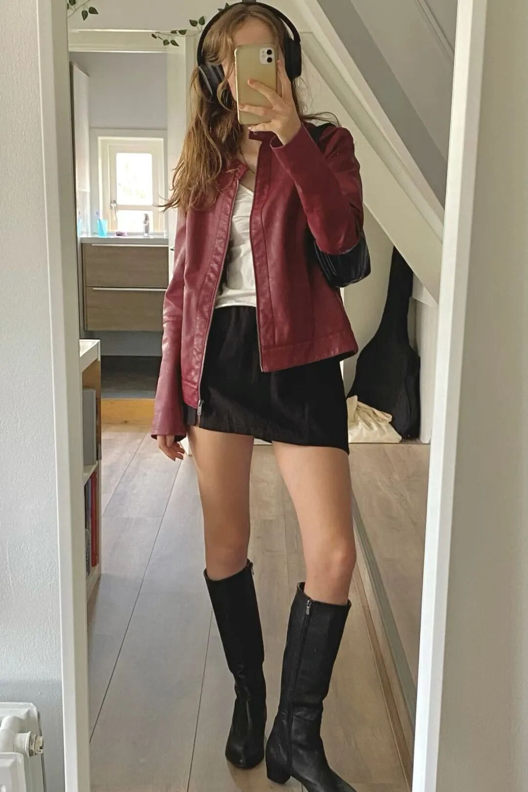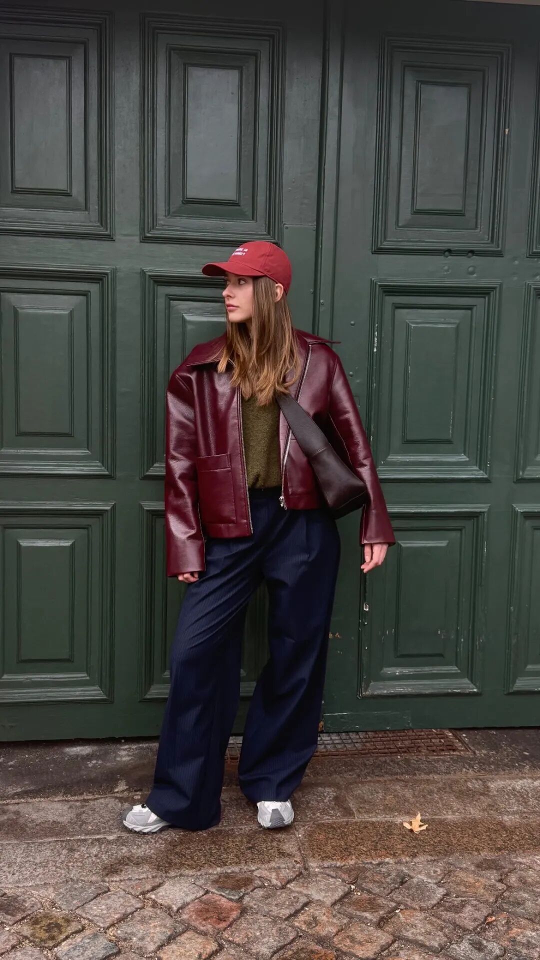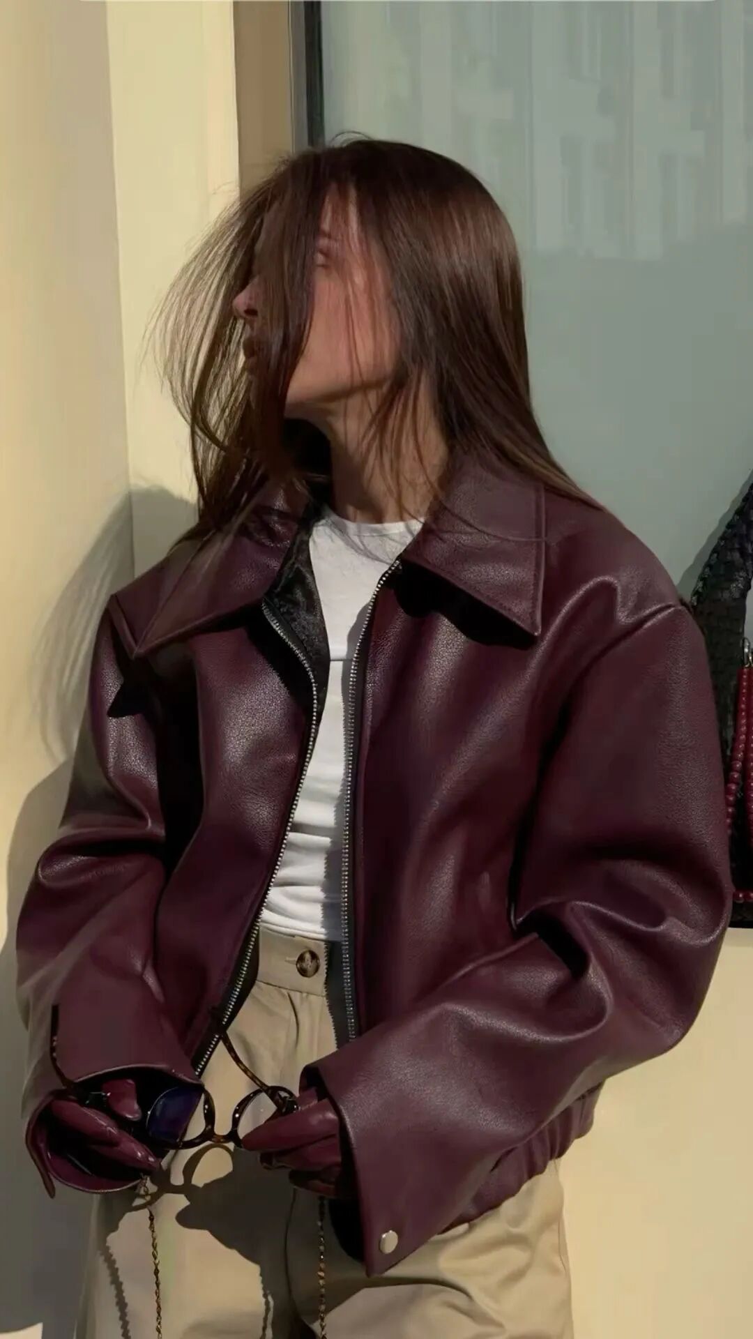 暗红色皮夹克内搭一件藏蓝色针织衫,