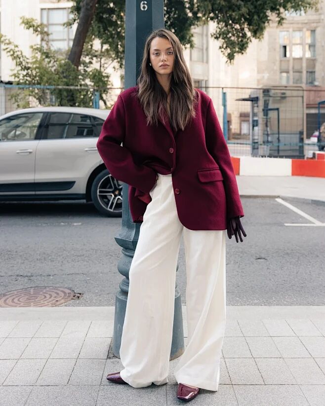在红西装与白衬衫之间叠穿灰色毛衣,