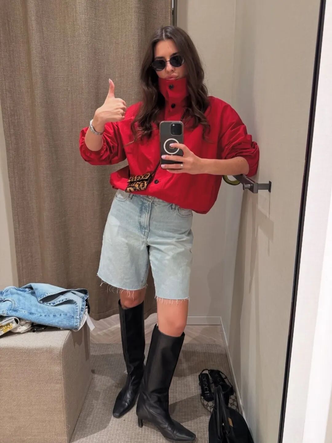 红色外套 + 黑色短裤 + 白色 T 恤,