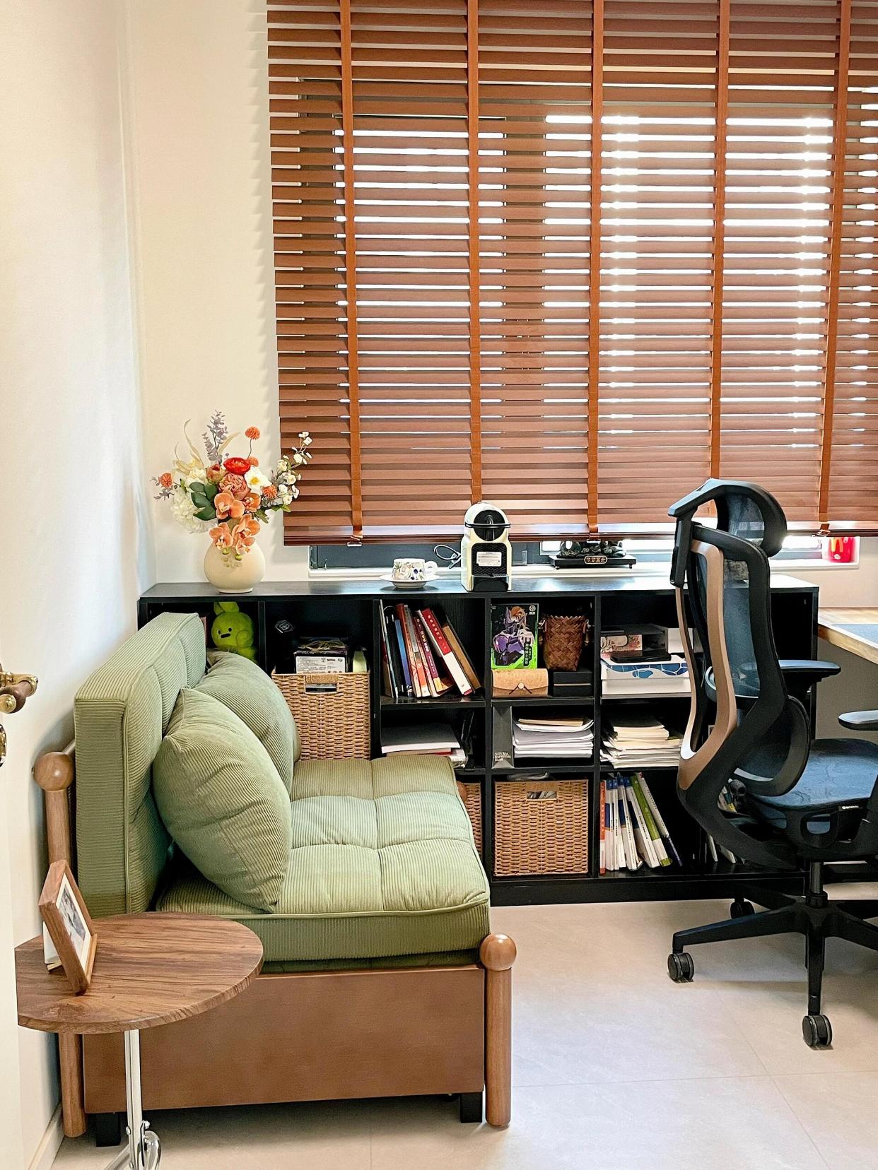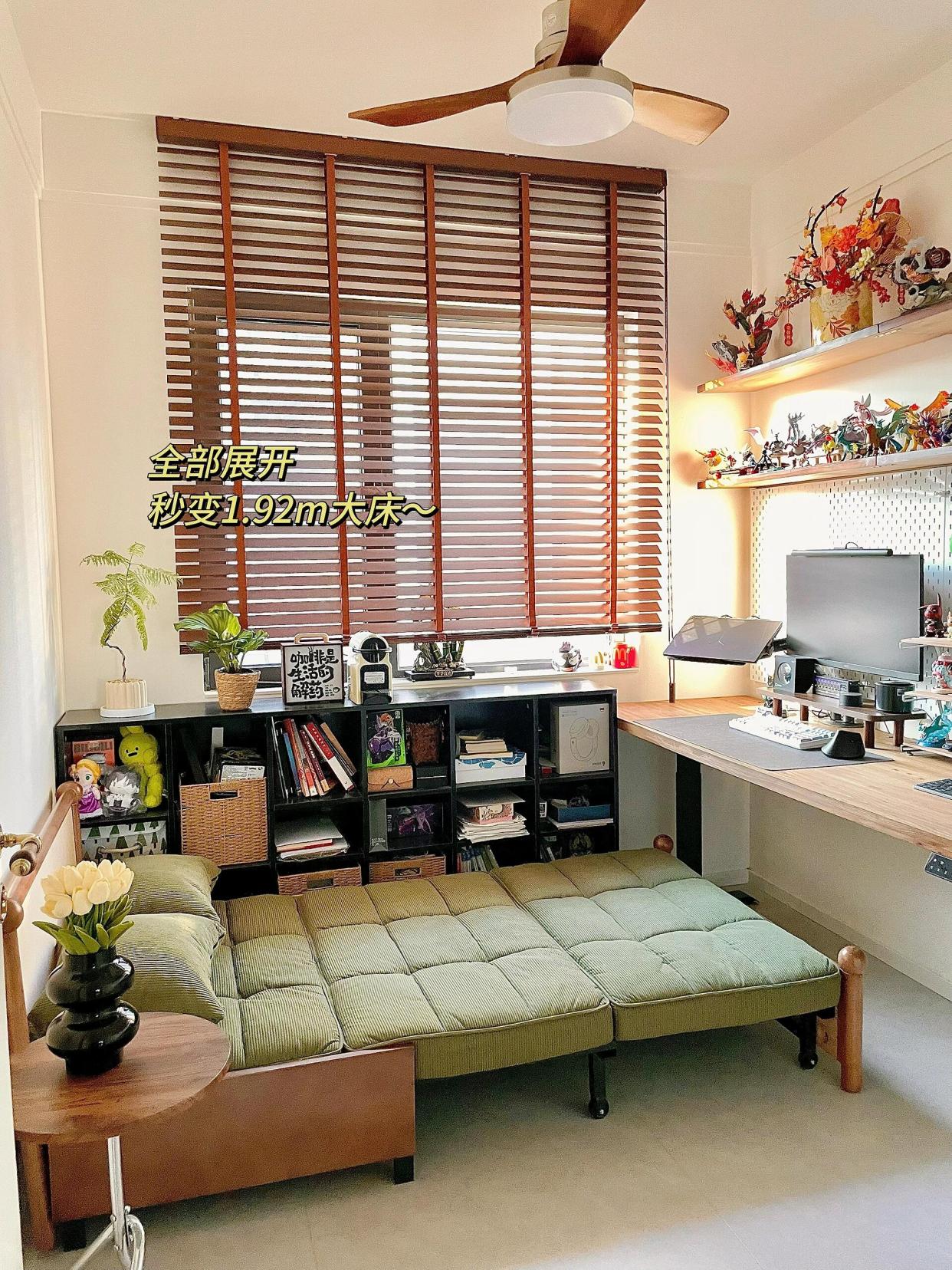 2m大书桌俩人一起用都不挤,窗边一排落地格子柜也贼能装,角落放一张沙发床,平时它是一张超舒服的沙发。