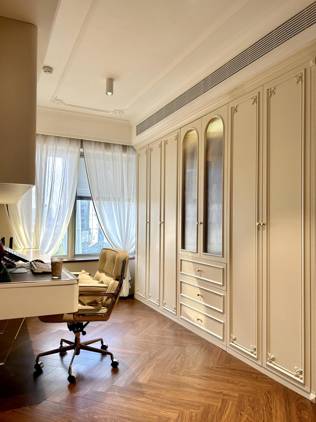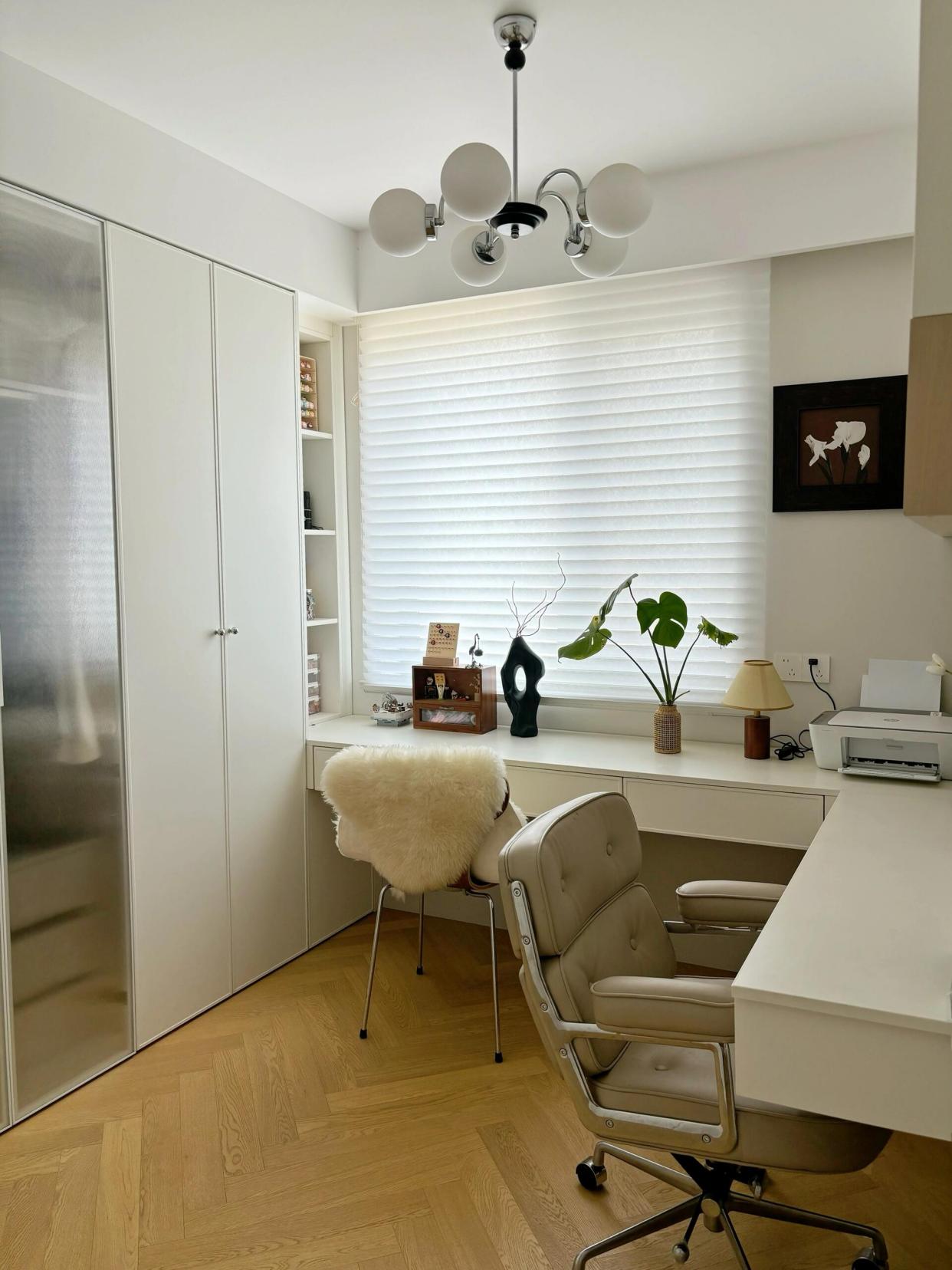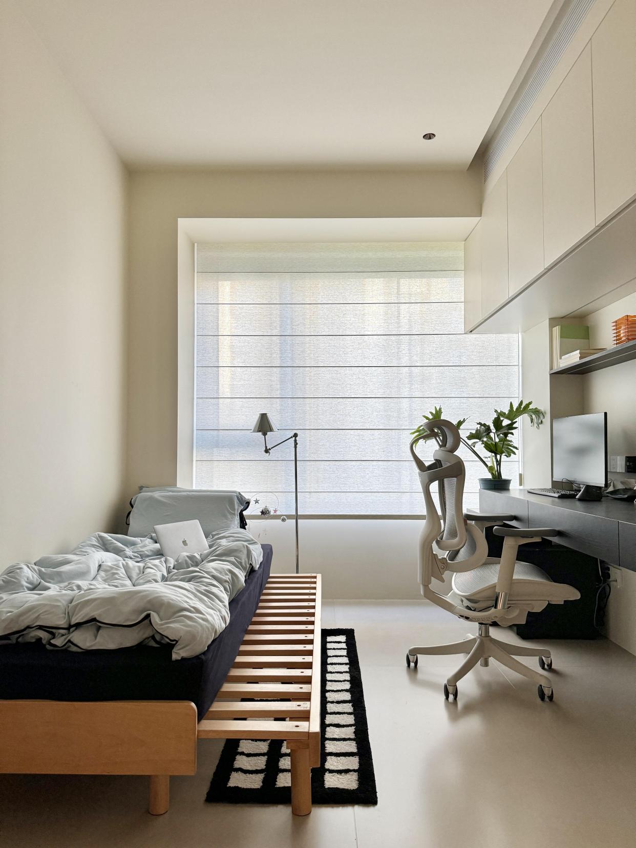 一整面一门到顶的满墙衣柜,可以放得下四季衣服和被褥,靠窗做成L型悬浮书桌。右侧桌面上方做吊柜增加收纳,这样一个房间不比闲置的次卧更实用?
