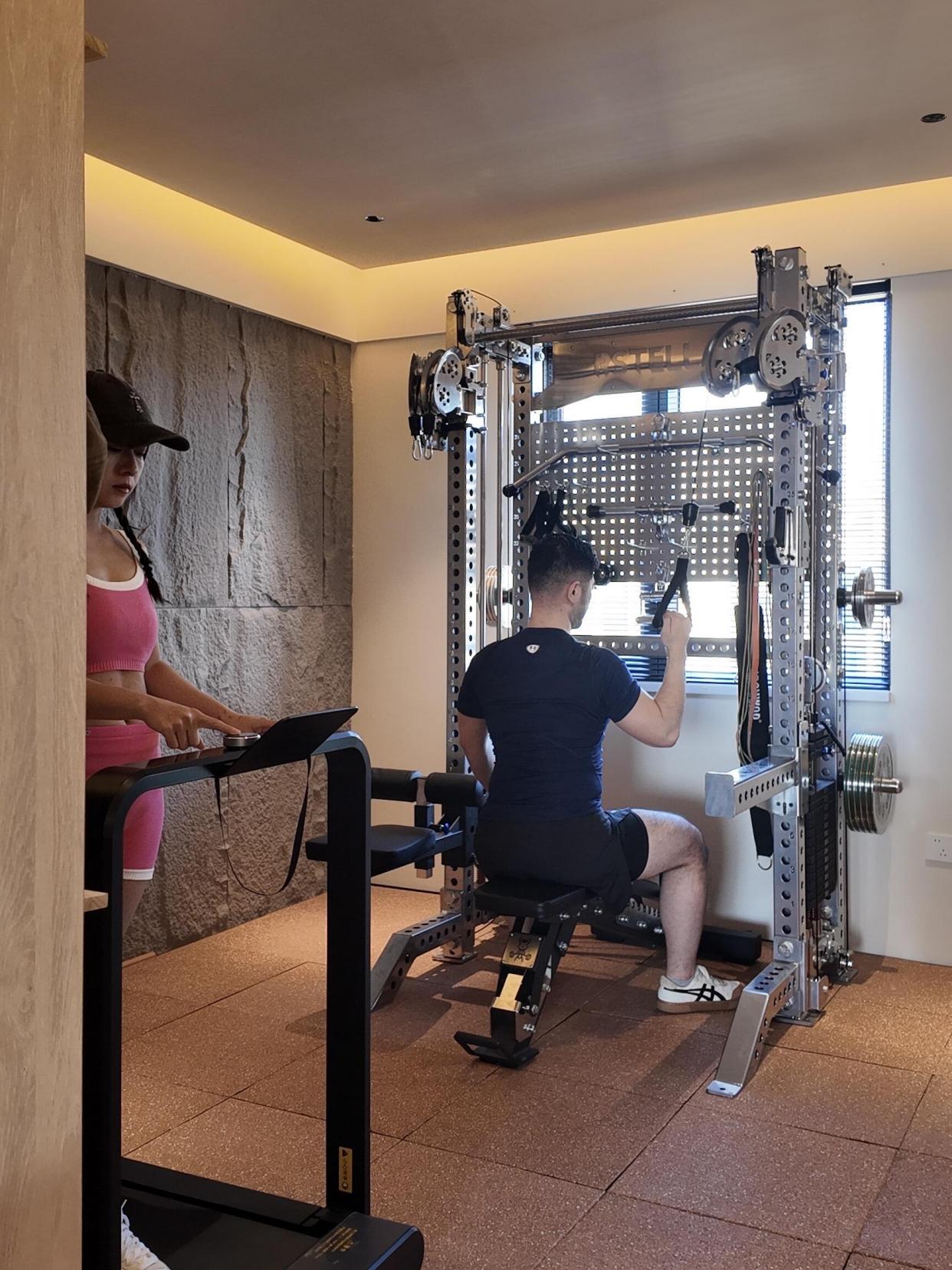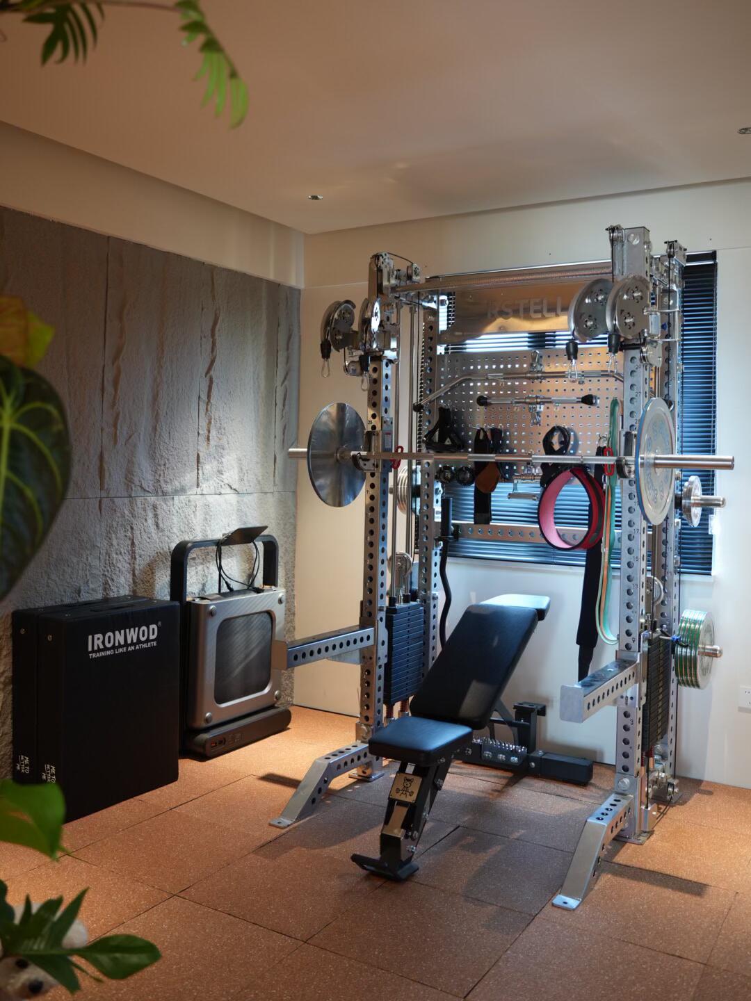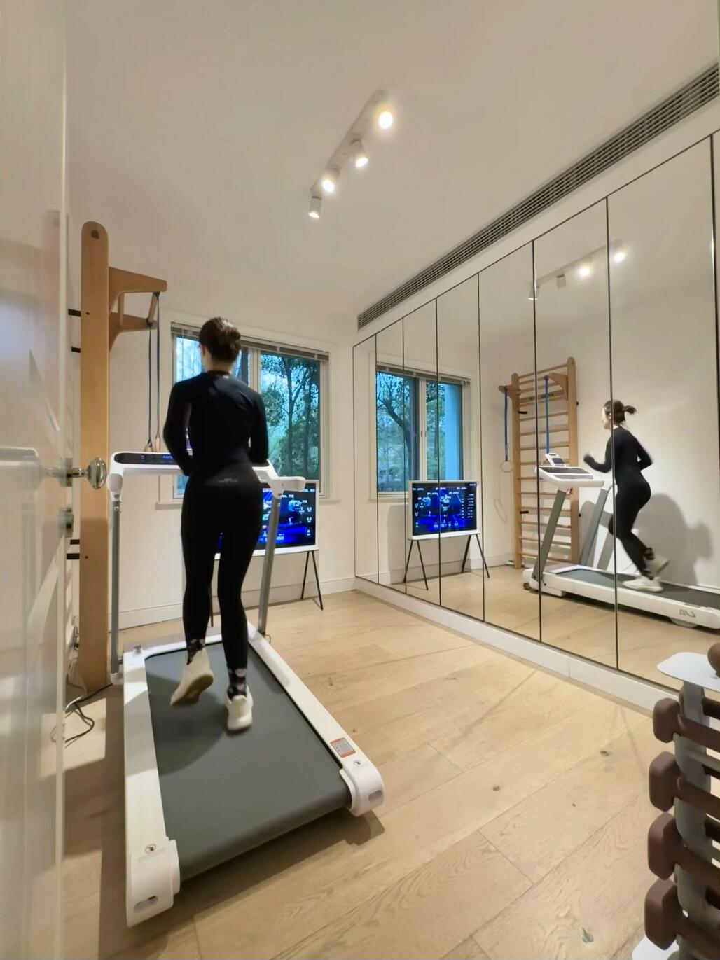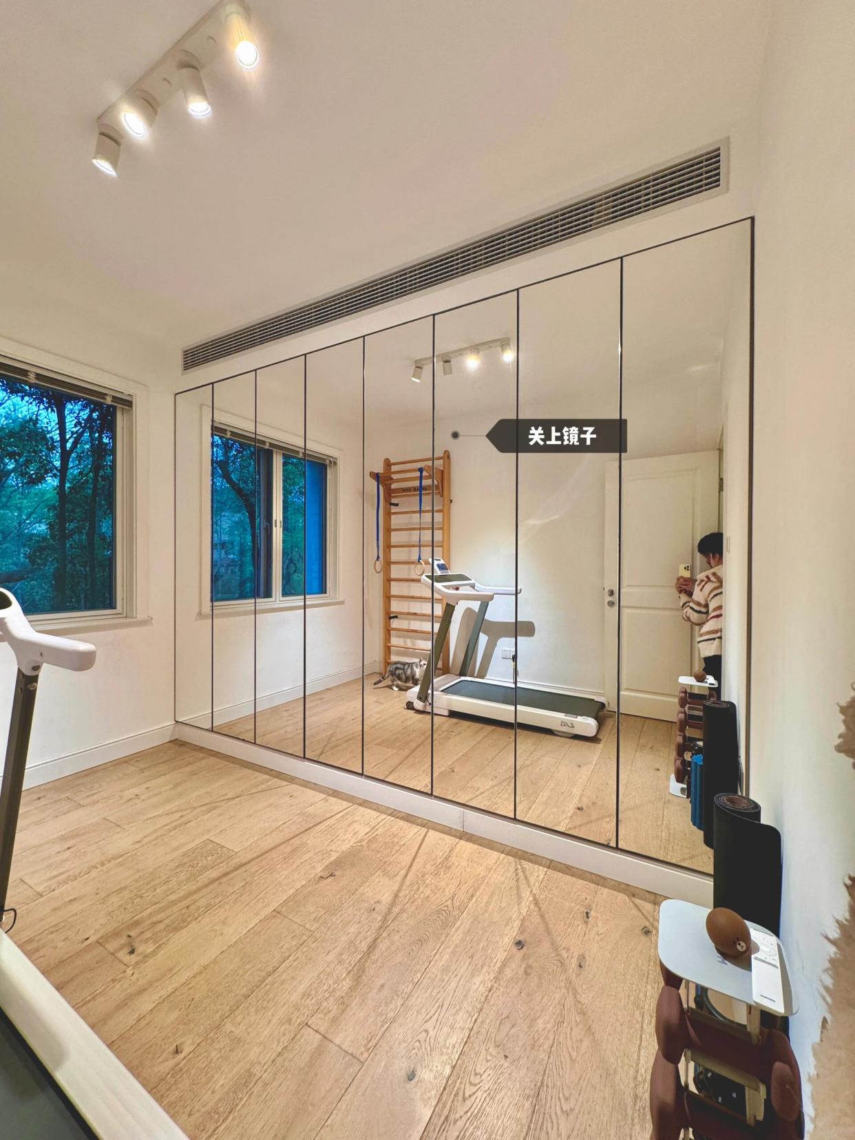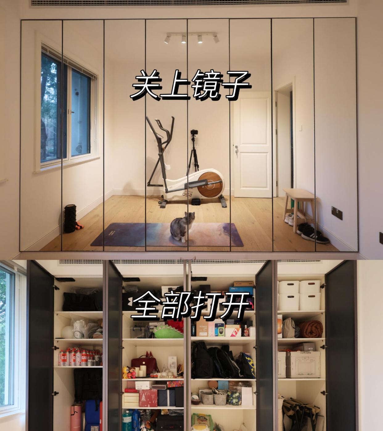 配上一些健身器材,椭圆仪、划船机、瑜伽垫,还有一些小器具,镜门一关就是间私人健身房。