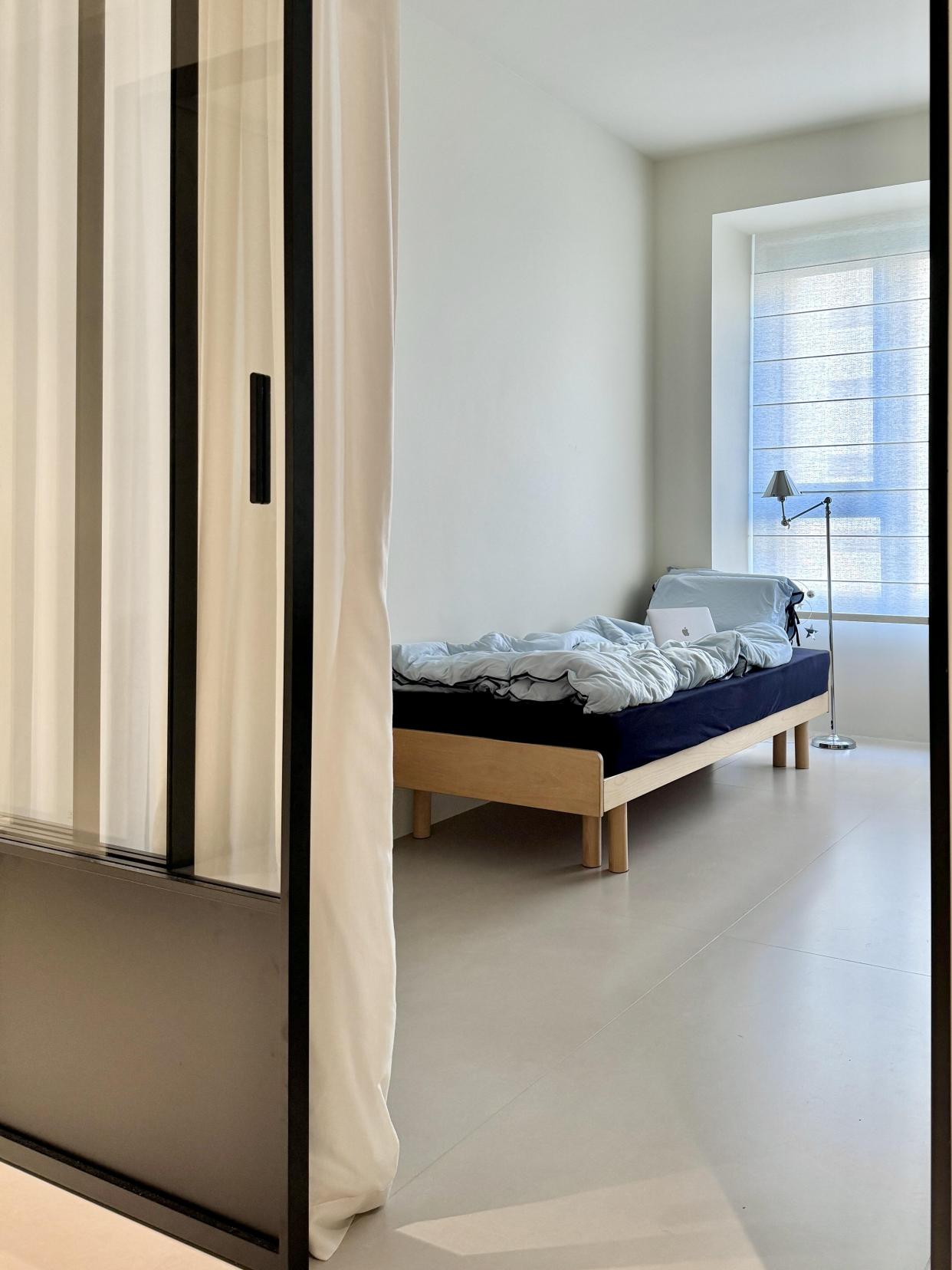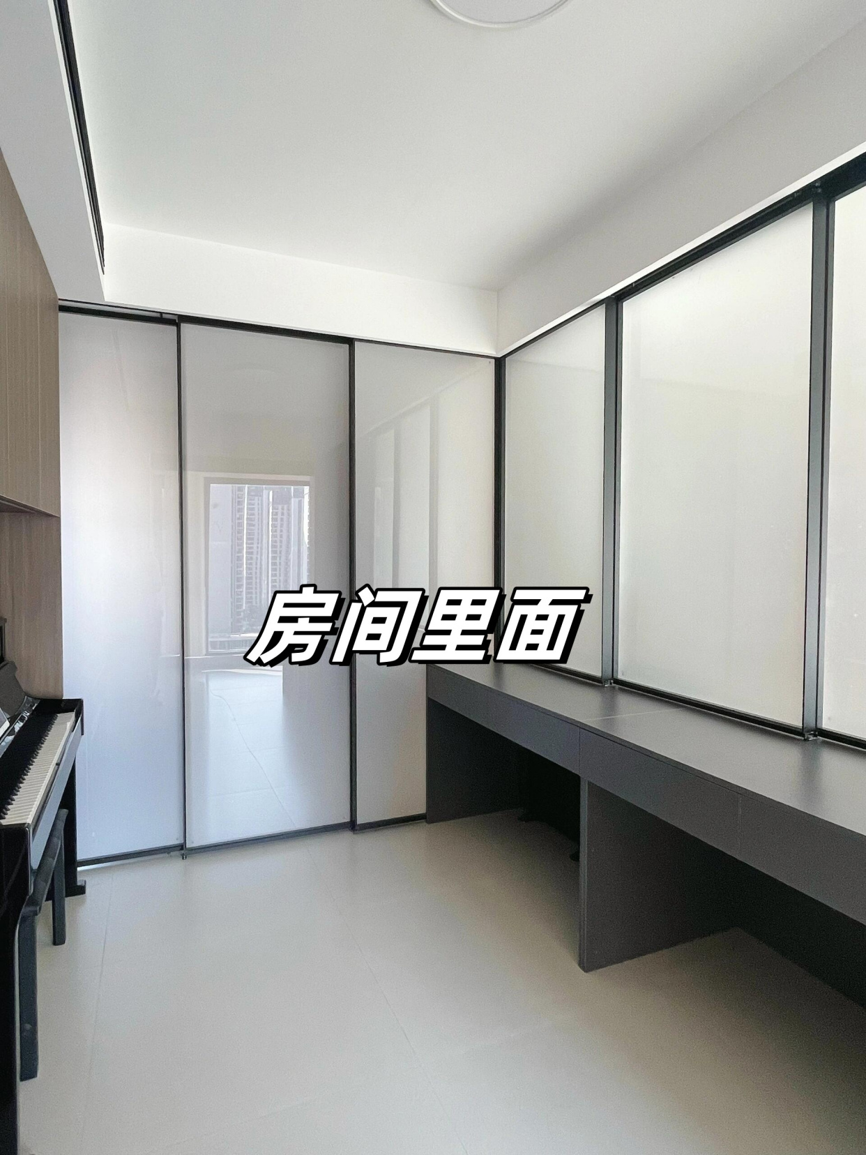 房间装的推拉门,装上自带柔光滤镜的罗马帘。小房间功能很齐全,全家人在家时都喜欢躲在这个小房间里。
