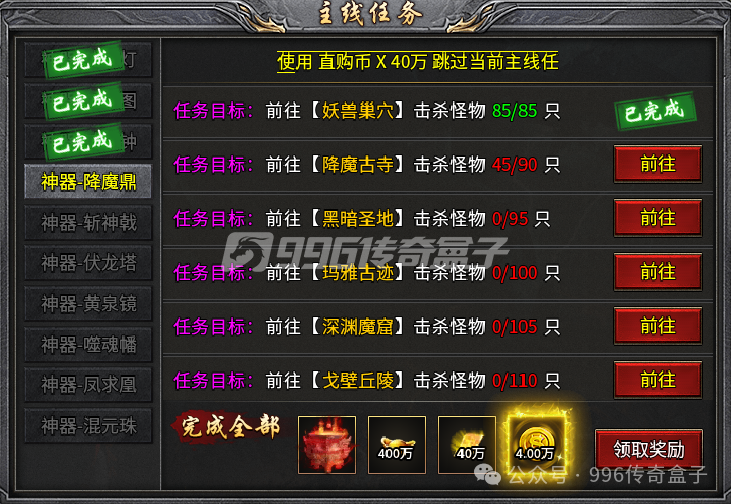 别担心,是花里胡哨的熟悉感,我放心了,要的就是这份张扬!送的东西就不细说了,太快太多,我也没看清,你领就完了。有主线任务,是十大神器,完成就能获得神器。这个任务挺简单的,就是跑图刷怪,使用直购币可以跳过主线,当然,没有必要,反正都是要刷怪的。