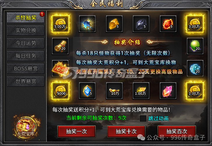 除了这个玩法可以领直购币,左上角的全民福利也能抽到直购币。每击杀十八只怪可以获得一次抽奖,不限次数,抽奖能获得大荒积分,积分可以在大荒宝库兑换材料,尤其是有一个超级VIP卡,可以用来提升VIP等级。无限刷币玩法也能快速获得超多直购币,每击杀十只怪就能增加一次开盒次数,开盒必定会获得大量直购币,开盒次数无限。跨服世界BOSS会爆专属,回收也可以获得丰厚的直购币奖励。全服活动也能获得超多直购币,还有限时福利中的各种福利,总之,这个服直购币是最不缺的!