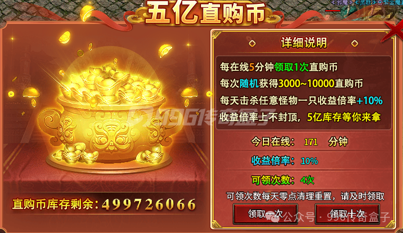 直购币算是这个服的主要货币,天天省钱会送五亿直购币,严格来说,是个玩法。一共五亿直购币,每在线五分钟就能领取一次,每次随机获得三千到一万。每天击杀任意怪物一只,领取收益倍率+10%,上不封顶,领取次数会在每天零点清。