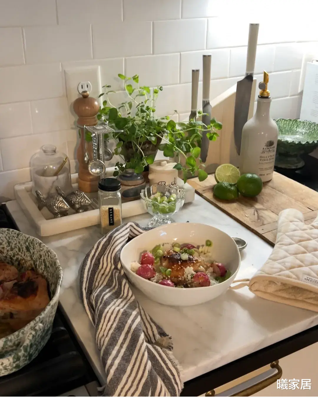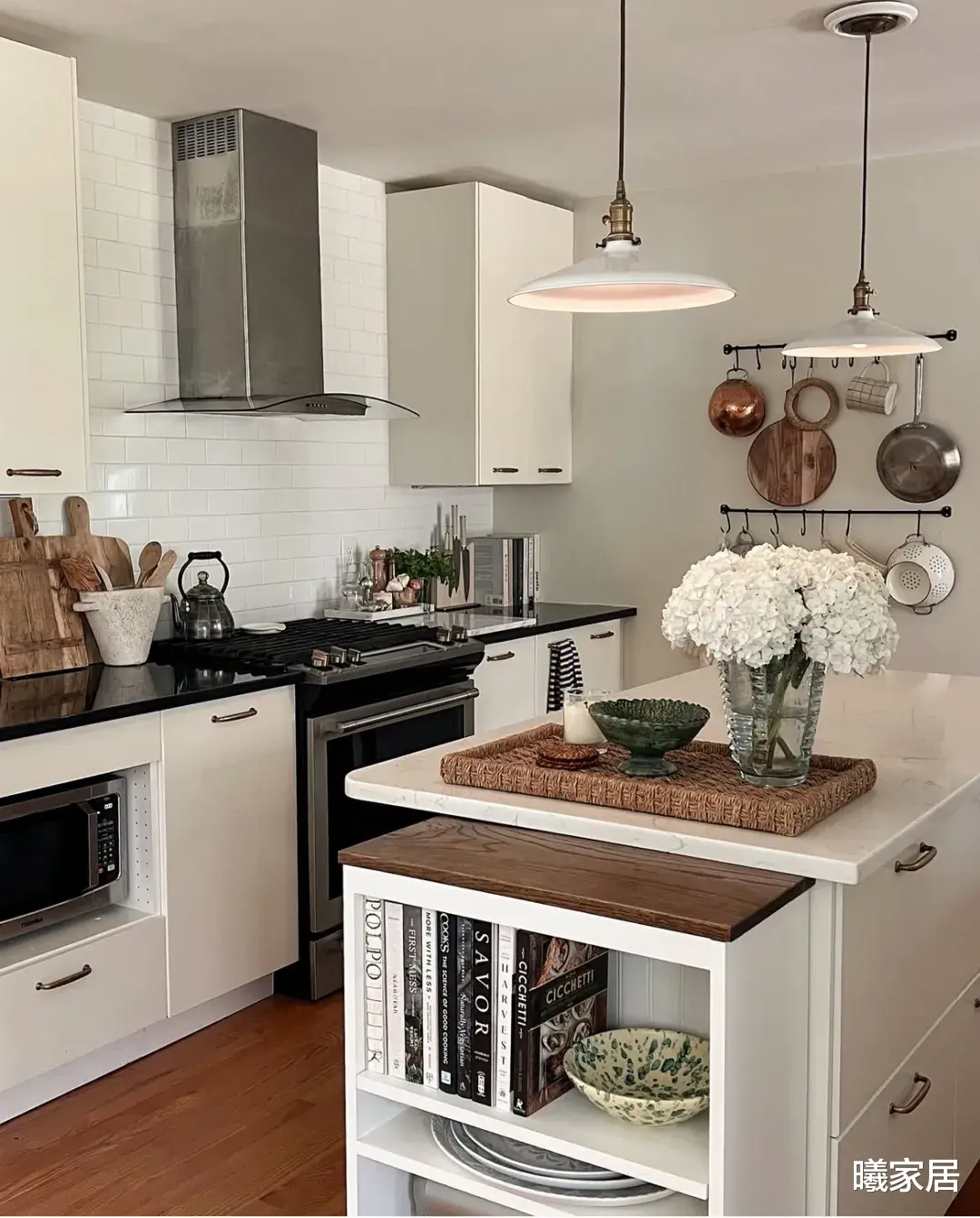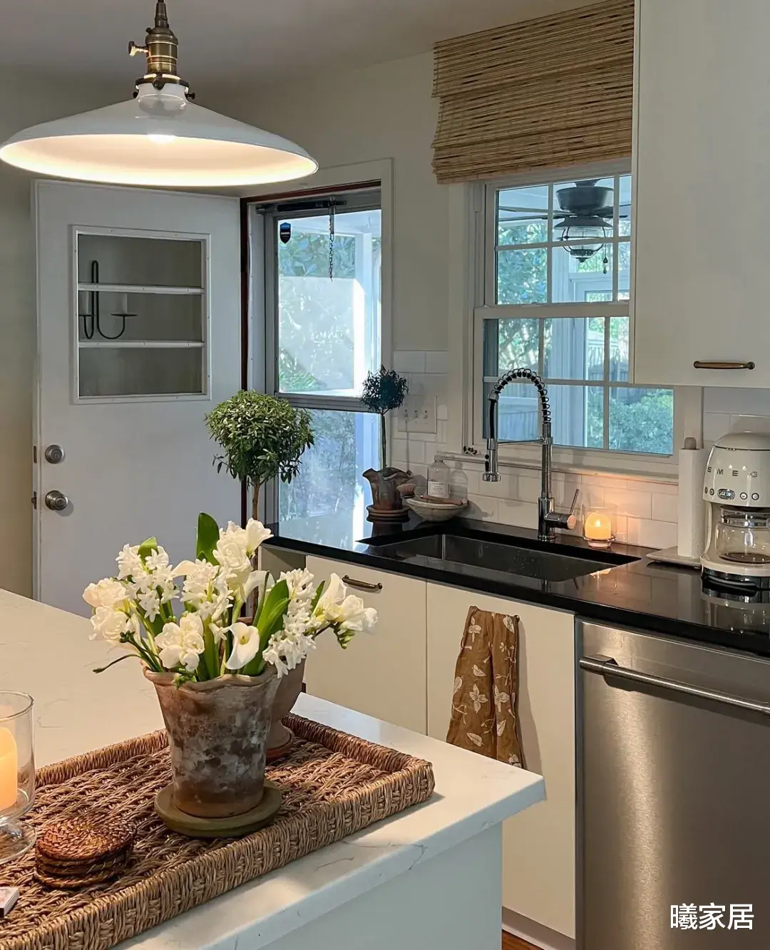 拥有宽敞岛台的厨房是很多人的梦想,因为可以带来更大的操作空间,不管是备菜、插花、用餐、储藏,还是当成装饰元素,都很必要。当然,还有中岛台上必不可少的花瓶,放上漂亮的花朵,在日复一日的下厨时间里,心里的富足感也会强一点。