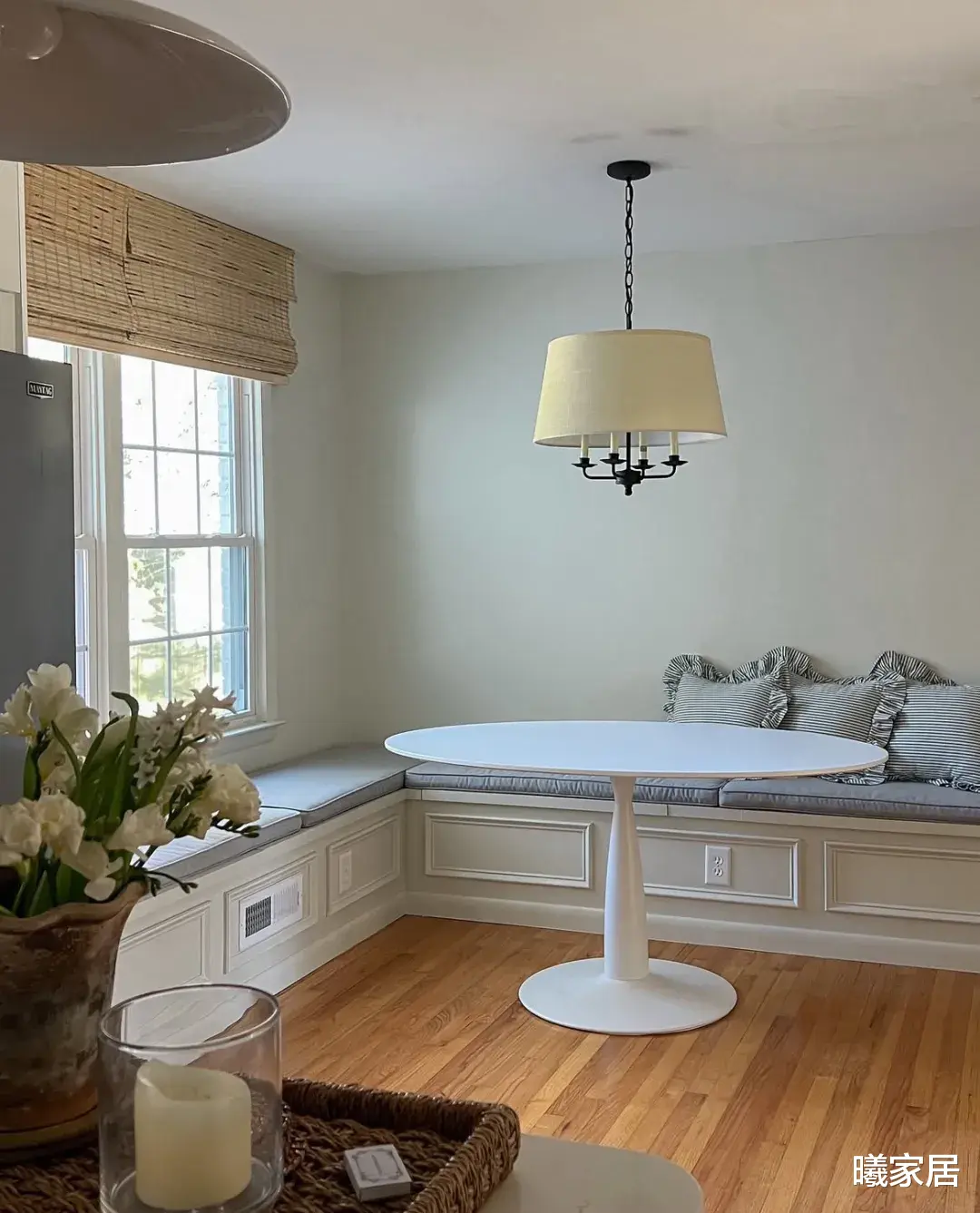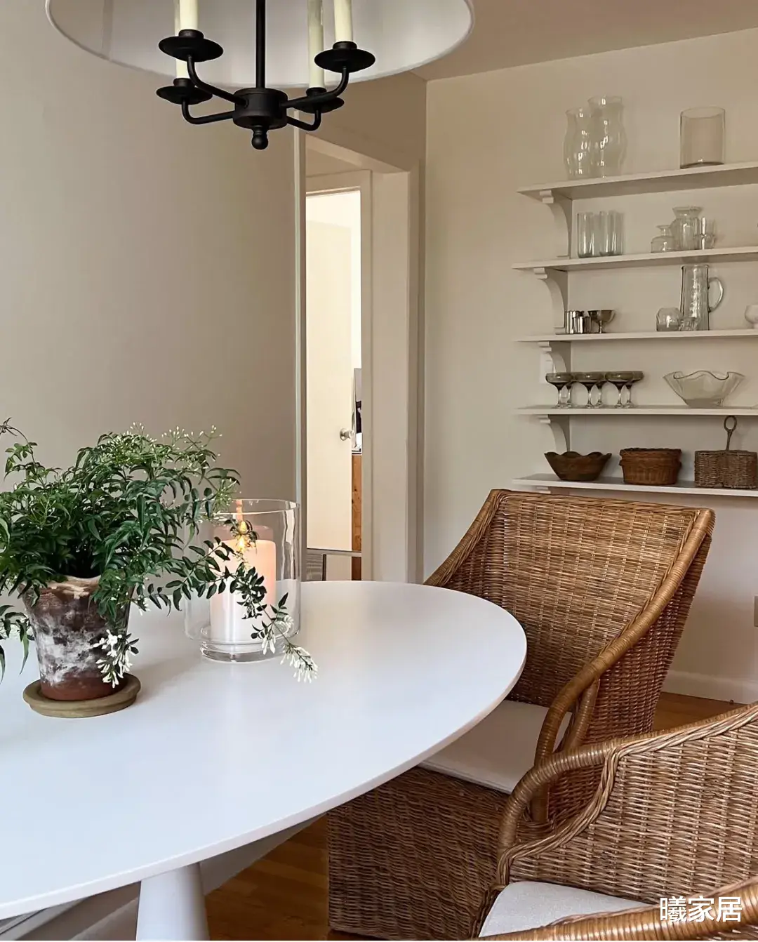 在整洁有序的空间里,为自己做一份治愈的早餐,为新的一天蓄满能量,太重要。女主选择了卡座+经典郁金香桌的早餐角配置,又将美式风的复古加入了现代生活中。搭配新添加的藤编椅子,材质色彩的碰撞带来更惬意轻松的氛围,深得主人喜爱。