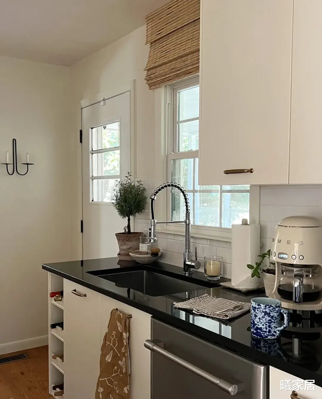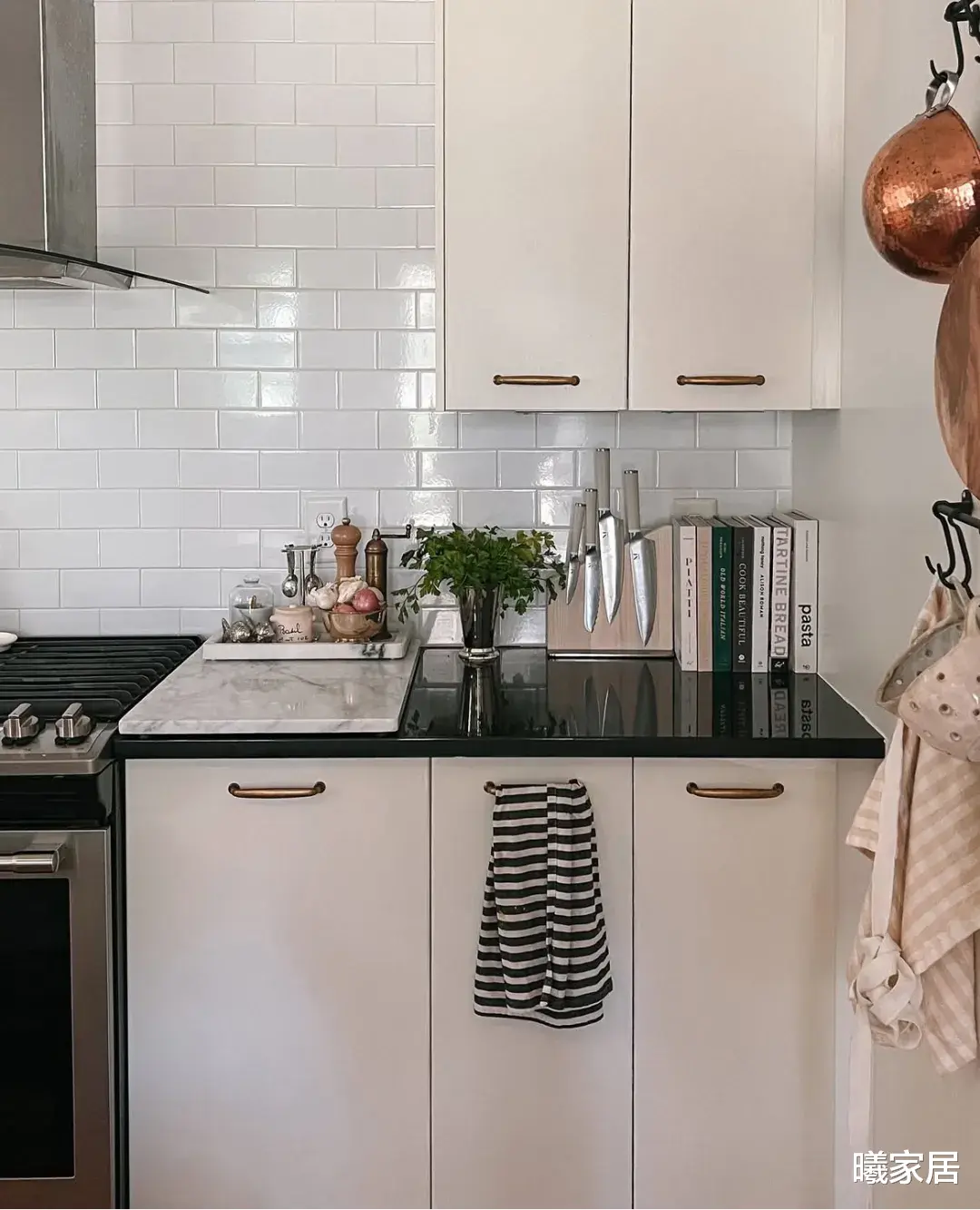白色橱柜黑色台面,把经典美式厨房的风格流传了下来,而且白色面积更大,表现出更敞亮的空间感。现代工业风的吊灯,设计小巧的SMEG复古风咖啡壶,还有角落点缀的植物,简约风的厨房也可以拥有满满的生活气息。