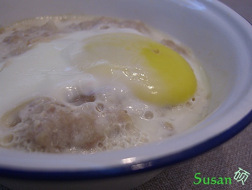 【南瓜茸炖蛋】 原料: 南瓜茸,鸡蛋(2个),椰浆(1/3罐)和细砂糖(3汤匙)。 步骤一:将鸡蛋和细砂糖充分拂匀。 步骤二:加入椰浆后,轻轻搅匀。 步骤三:将南瓜茸加到蛋液中,细致地搅拌均匀。 步骤四:将南瓜茸蛋液用筛滤过后,口感会更滑溜。 步骤五:把筛滤过的南瓜茸蛋液倒入炖碗内,用中低火在微波炉内叮5分钟至凝固,即可食用。