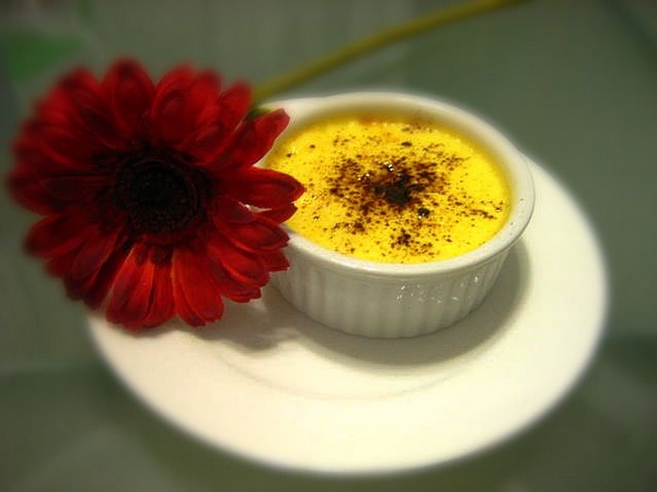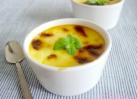 【法式焦糖炖蛋】材料:鲜奶油125g 牛奶125g 蛋黄两个 过程: 蛋黄放入奶油中拌匀 牛奶中加入40克砂糖(我觉得还能再少放点,这个分量吃起来有点过甜),放入小锅中煮至砂糖溶化 把奶油拌入煮好的牛奶中,再加热一会 烤盆加热水,放入烤箱,烤箱预热至200度后,放入放到模具中的牛奶溶 烤40分钟左右,取出来,表面上洒上白糖 烤箱预热到最高温度,将蛋液重新放回去,烤到表面变焦,就完工了