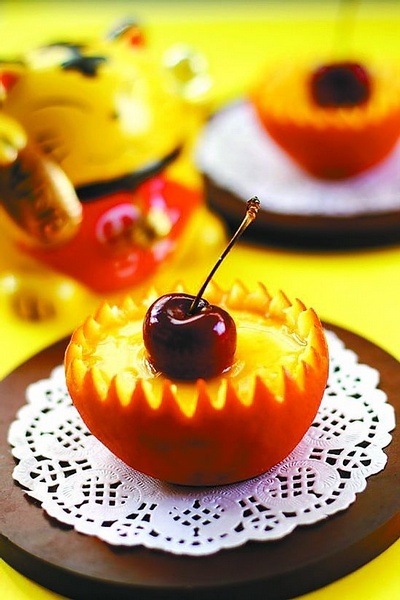 【清香鲜橙蒸蛋】材料:橙(1只)、鸡蛋(2只) 调料:白糖(1汤匙) 步骤: 1.鲜橙洗净拭干水,放在砧板上用手掌轻揉5分钟。 2.将鲜橙切成两半,掏出橙肉,橙皮做成盛器。 3.将橙肉放入榨汁机内打成橙汁,滤去果肉渣。 4.鸡蛋打入碗内,加入1汤匙细砂糖,打散成蛋液,与橙汁混合均匀。 5.分别将蛋液倒入两只橙皮中,倒至八分满便可。 6.将橙皮蛋液放入盘中,盖上一层保鲜膜待用。 7.烧开锅内的水,放入橙皮蛋液,加盖以中火隔水清蒸10分钟。 8.取出蒸好的鲜橙蒸蛋,撕去保鲜膜,即可上桌。