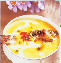 【鲫鱼炖蛋】原 料: 鲫鱼2条(约500克),鸡蛋3个,生姜丝少许,精盐适量,植物油适量,葱花少许,料酒少许,味精少许。 做 法: 1、将鲫鱼用清水洗净,在鱼身两侧划几道斜刀花。 2,将鸡蛋打如汤碗内,撒上葱花,盐,味精,待用。 3、锅置火上,放入适量植物油,待锅内油烧热,下鲫鱼,料酒及生姜丝和水适量(水的多少以装鸡蛋的汤碗的八成满为准),用旺火烧,待鱼汤变白呈牛奶样,关掉火,待用。 4、将鸡蛋搅打均匀,加入鱼汤,再放入鲫鱼,上笼蒸至鸡蛋凝固即可。 附注: 如家常做这道菜,家中无蒸笼,可在锅中加水适量,汤碗底垫上盘子放在水中,将锅置旺火上烧即可。【墨鱼炖蛋】原料:小墨鱼 鸡蛋 葱 姜 酒 盐 做法: