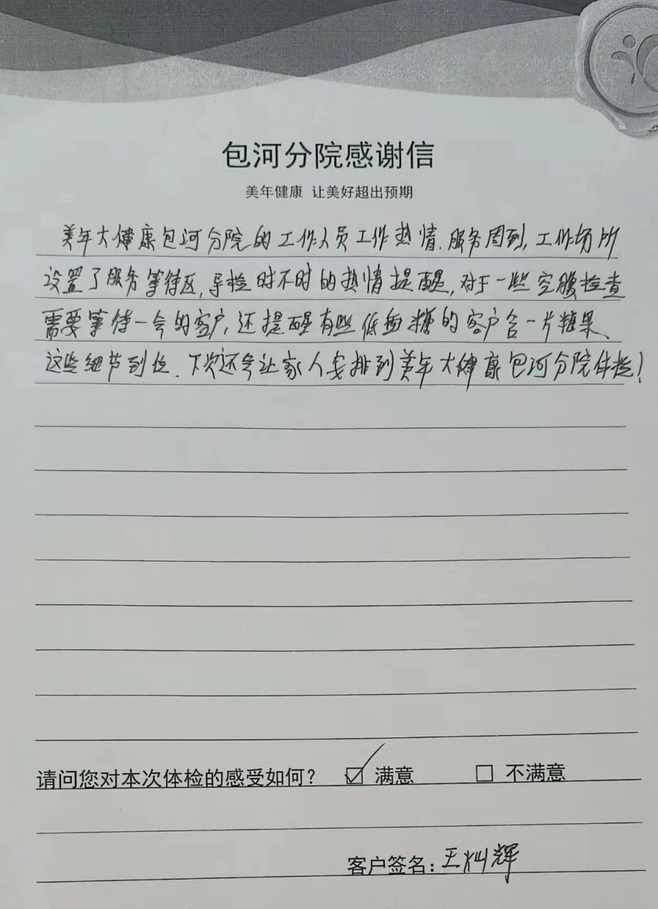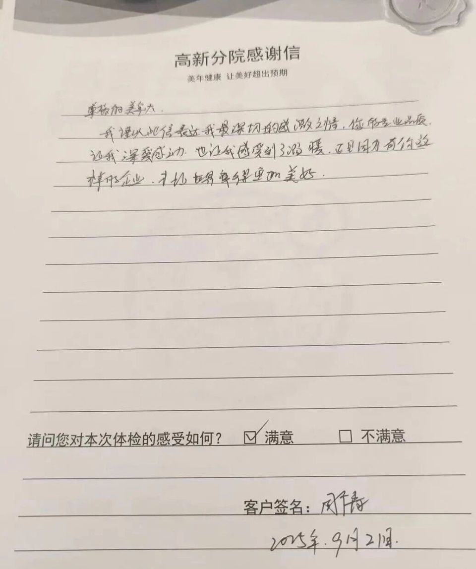 “我谨以此信表达我最深切的感激之情,美年的专业品质让我深受感动,也让我感受到了温暖。”—— 来自高新分院周女士的认可。